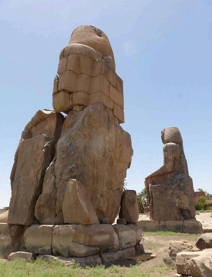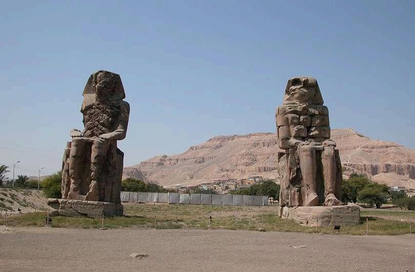 Miden aproximadamente 18 metros de altura y están tallados en arenisca, representan al faraón Amenhotep III sentado en un trono, con las manos sobre las rodillas y la cabeza cubierta por la corona real. Estas imponentes estatuas, ricamente decoradas con inscripciones que celebran su reinado y logros, son un testimonio de la habilidad y el arte de los escultores egipcios.