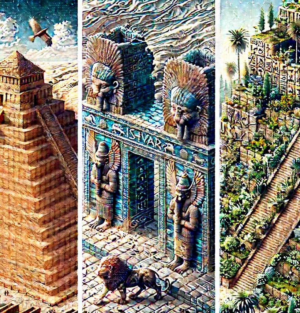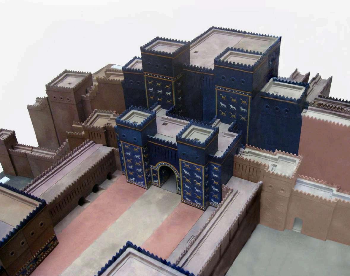 Revestimiento de ladrillo esmaltado: Para embellecer los edificios, especialmente durante el periodo neobabilónico, se empleaban ladrillos esmaltados y policromados. La famosa Puerta de Ishtar en Babilonia es un excelente ejemplo de esta técnica, donde los ladrillos tenían una capa de esmalte azul y estaban decorados con figuras de animales en relieve. Madera y piedra: Aunque la piedra no era abundante, se utilizaba de manera limitada, importada desde otras regiones para detalles ornamentales o bases. La madera, importada también de regiones montañosas, era usada en vigas y estructuras de techos.