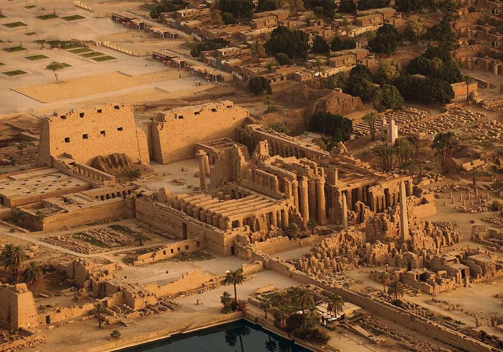 El Templo de Karnak es uno de los complejos religiosos más grandes del mundo y destaca por su monumentalidad y decoración artística. Su arquitectura se caracteriza por una serie de pilonos, enormes columnas con capiteles en forma de loto, y relieves detallados que narran las hazañas de los faraones