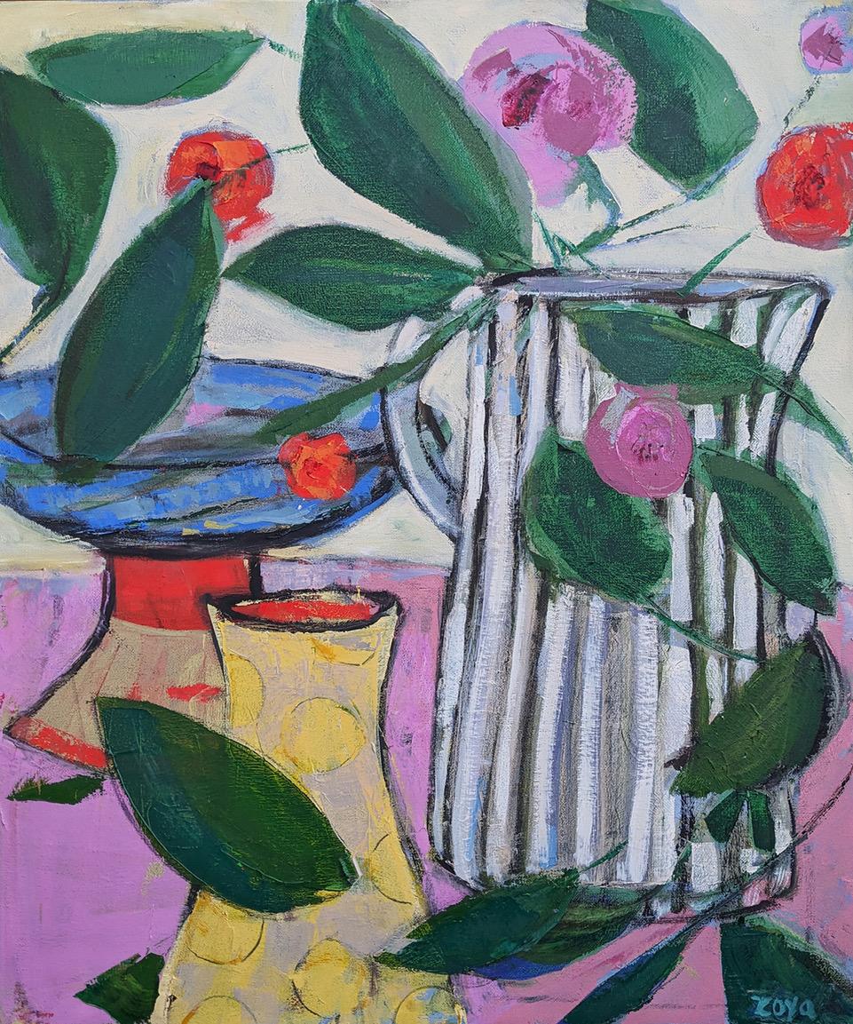 Zoya Scholis is a Monterey and Bay Area denizen, with a BA in Studio Arts (1993). A former bilingual school teacher, in 2007 she became a full-time artist and instructor, creating and leading Art for Personal Growth workshops. Her post-grad education includes Advanced Painting with Donald Feasel at San Jose State University and Katie Hawkinson at Stanford University. Among her many influences are Richard Diebenkorn, Joan Savo, and the drawings of Picasso. Primarily a process painter, most of Zoya's work feature abstract forms from nature–figures, birds, leaves, petals, fruit. Much of her figurative work has a dreamy Fairytale feel. For Scholis, art making is an exploration of psyche and an experiment with the Divine.
