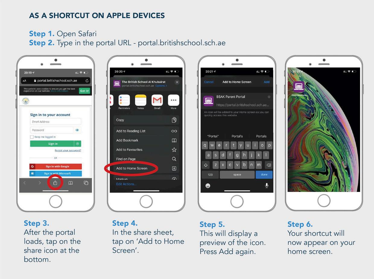 Please follow the instructions below to save the BSAK Parent Portal as a web app to your device This will allow quick and easy access to the Portal.