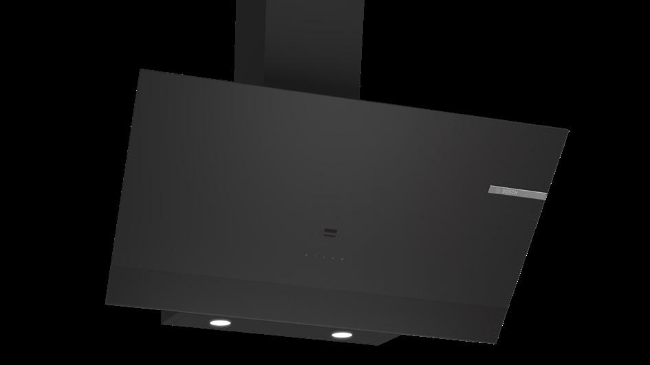 90CM WALL MOUNTED EXTRACTOR, BLACK WITH GLASS CANOPY EXHAUST OR RECIRCULATION OPERATION