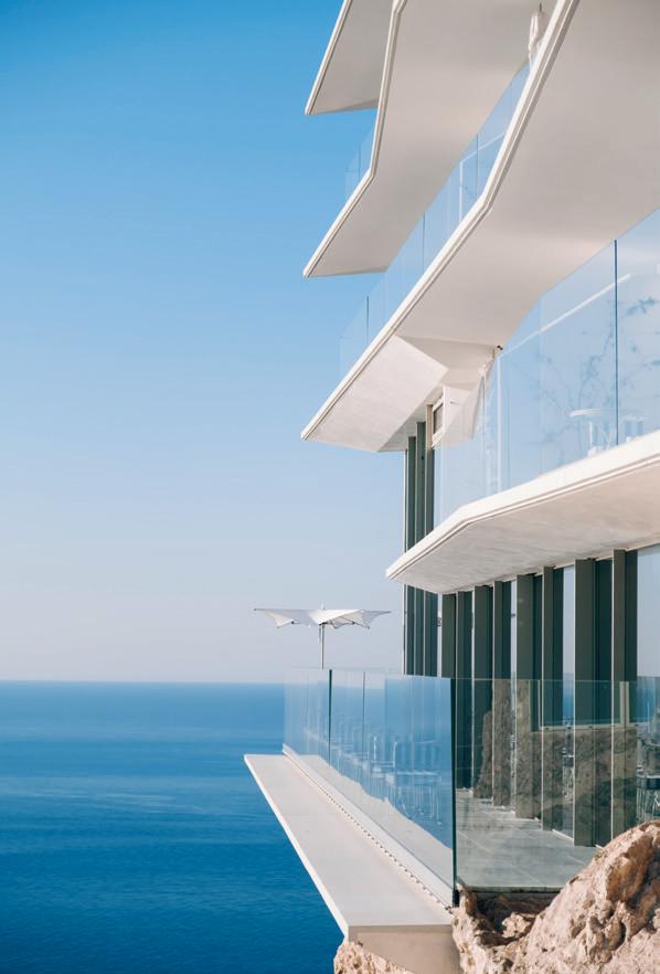 As such, every considered design detail is on show, not hidden from view. The powerful sails add drama and depth to the skyline while supporting the central structure of the building, the staircase has been transformed into feature rather than necessity, as bold pink steel beams contrast against white marble treads and a complex web of external steelworks, rods and ropes show the movement of the hotel in real time. The end result is glorious, unique and, we hope, a lasting and tting tribute to the great Richard Rogers.