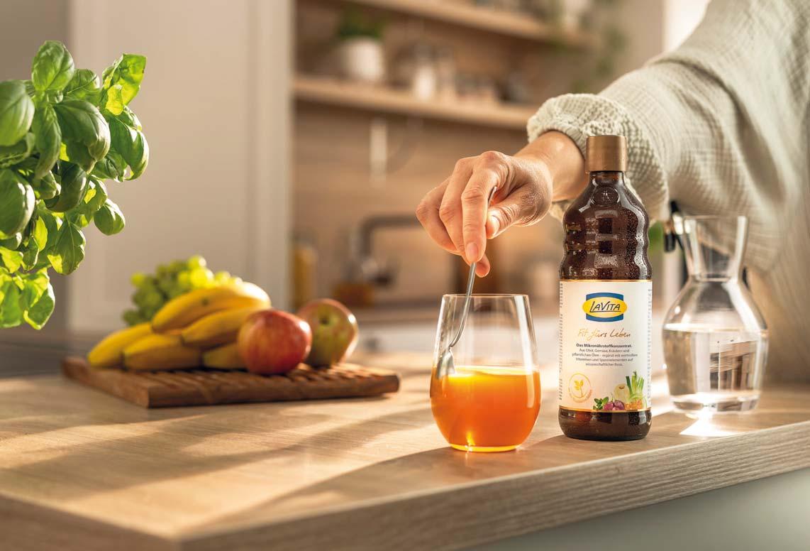 Ein Esslöffel LaVita Konzentrat in ein ff Glas Wasser rühren, ergibt ein leckeres und bekömmliches Getränk, das alle wichtigen Vitamine und Spurenelemente liefert. Das spüren viele Menschen in Form eines stabilen Immunsystems1 oder durch mehr Energie2