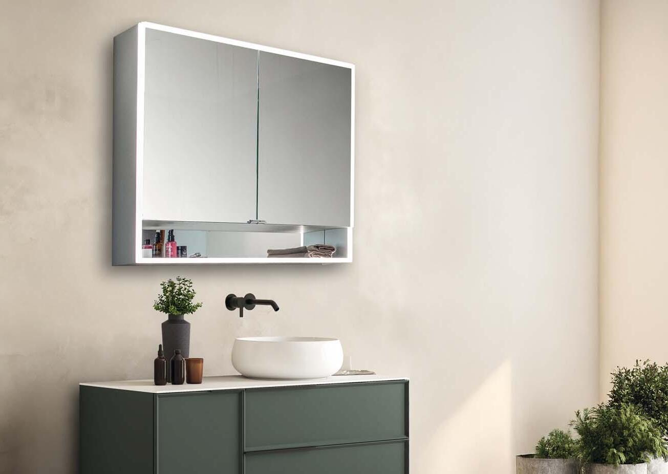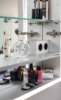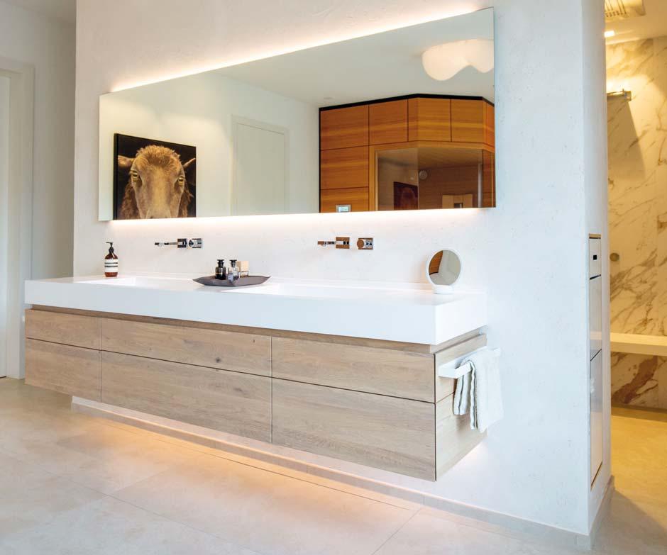 a m Walensee. Ein feines , umlaufendes Lichtband hinter Glas sorgt für eine gleichmäßige Ausleuchtung und lässt den Schrank nahezu schwebend wirken.