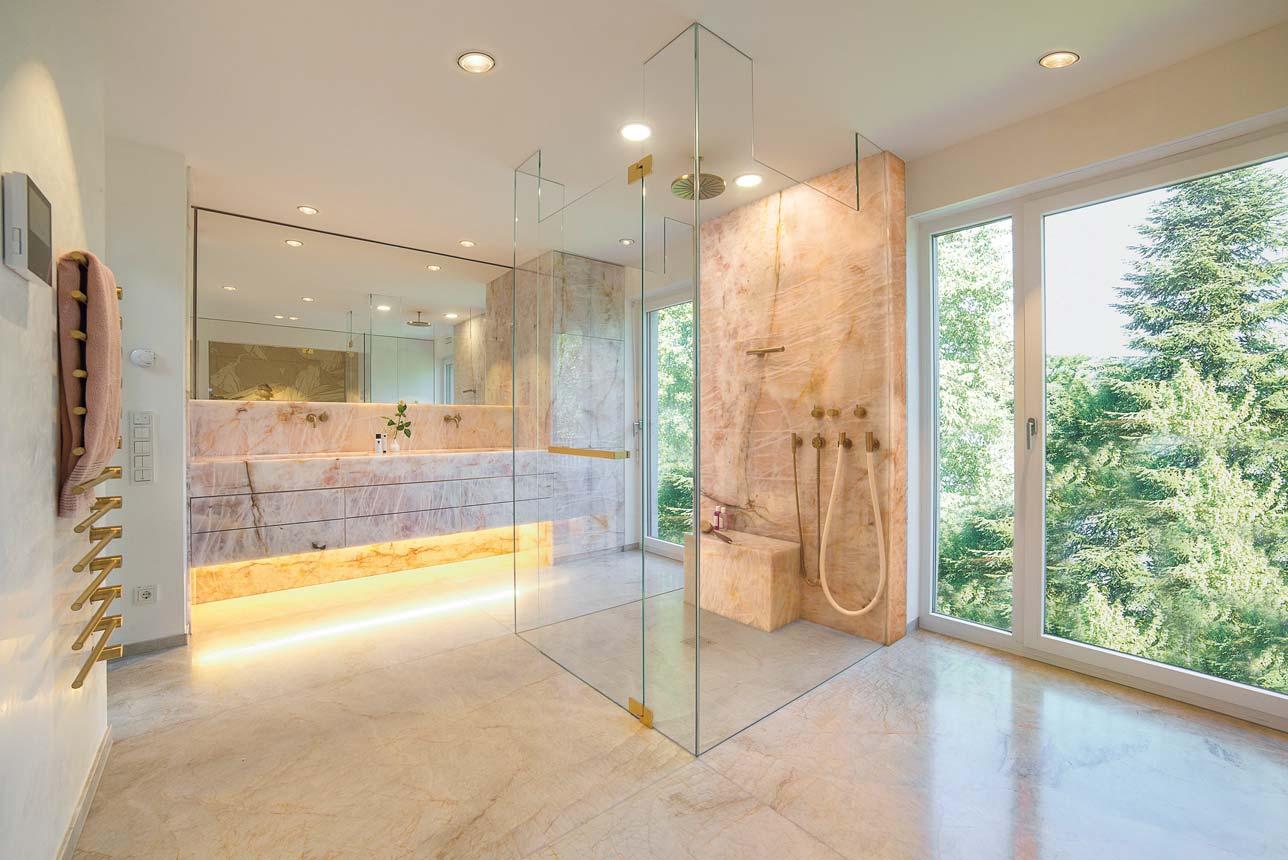 Das ist doch wirklich mal ein „frei stehende“ Dusche. Der Clou: durch die raumhohe Verglasung wird der Übergang zum Außenraum fließend gestaltet und das Innere mit natürlichem Licht geflutet, was eine warme und einladende Atmosphäre schafft. Im Zentrum des Raumes steht aber die elegante, freistehende Dusche mit ihrer schlanken, schwarzen Armatur, die das minimalistische Konzept unterstreicht.