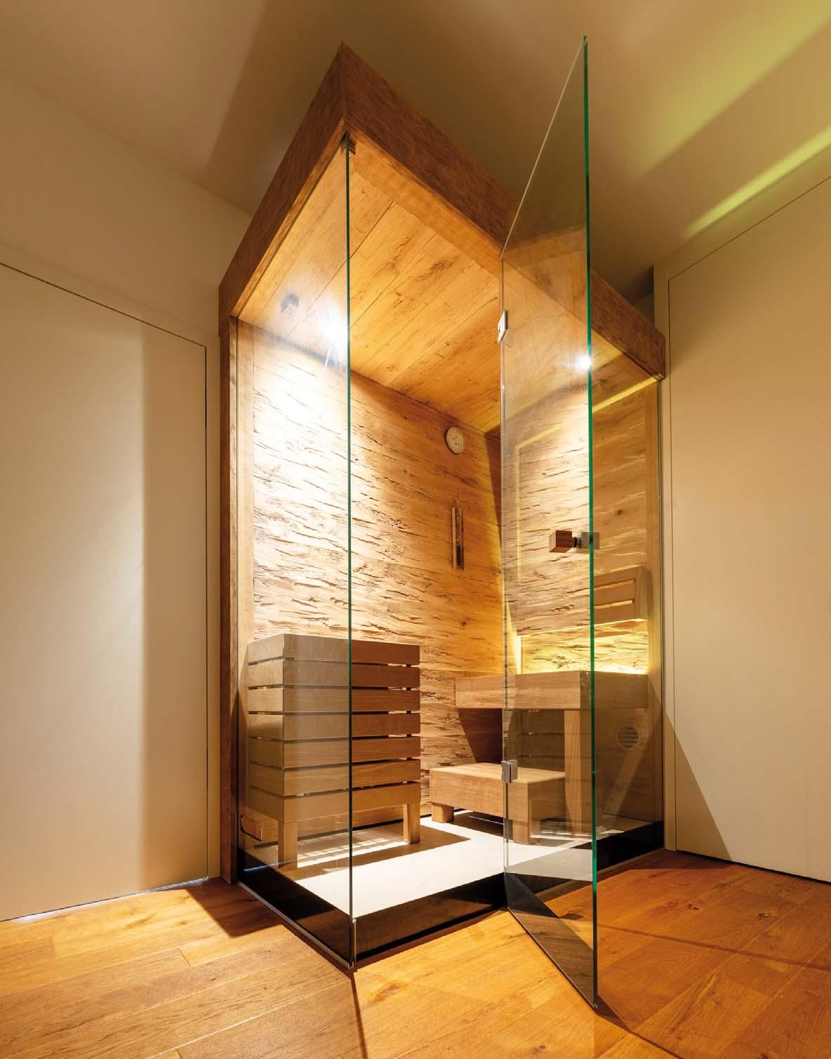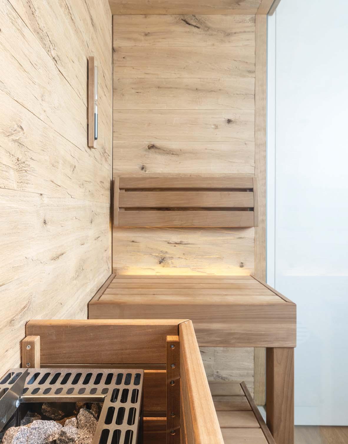 D e r v o rh a n de n e R au m sc hr ä nkt e d i e M ö glichkeiten jedoch stark ein. Der verw inkelte Grundriss und die stufi g versetzt en Über g än g e und Kanten erforderten i ndividuelle Lösungen und planerisches Fingerspitzengef ü hl – ein ideales Pro j ekt für die Experten von Deisl Sauna & Wellness, die ma ß geschneiderte Wellnessanlagen p lanen und fertigen. „Ich pers ö nlich m ag Ob j ekte, die in sich harmonisch gesta lte t s i n d , un d b e i d enen s i c h e i n s ti mm iges Gesamtkonzept durch die g esamte Immobilie zieht. In guter Zusamme n a r be it mit de m Arc hite kt u r bü ro B aukoo p era ti ve i s t uns d as auc h b e i di esem Wellnessbereich gelungen“, so Saunap laner Martin Lackner ü ber die spann en d e A u f ga b e.