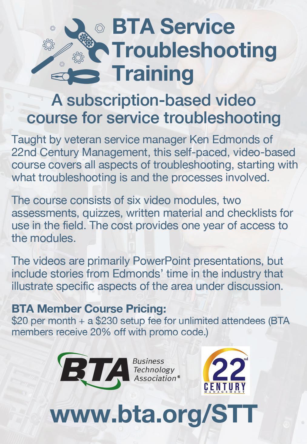 re you looking to improve your bottom line or further diversify your business? Two benefits that are completely free with your Business Technology Association (BTA) membership are the association’s Building My Business and Diversifying My Business webinars, which can help you do both of those things. This month, BTA has three of these webinars scheduled.