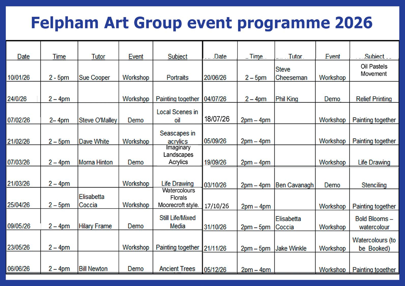 2025 has been a year of reflection and heartfelt loss for the Felpham Art Group. We said goodbye to treasured pillars of our community, namely our long-serving and much-loved Chairman, Terry Collins, our devoted Honorary Secretary Sue Harrington and our esteemed President, Lady Caroline Marshall.