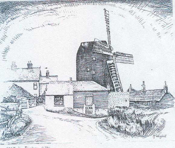This sketch of 1879 (right) shows the White Mill with the coastguard’s flagstaff in the background. It shows the mill as derelict and it was eventually claimed by the sea and demolished in 1879. The brick and stone from the base of the White Mill were re-used in the building of the stables and garden walls of Turret House.