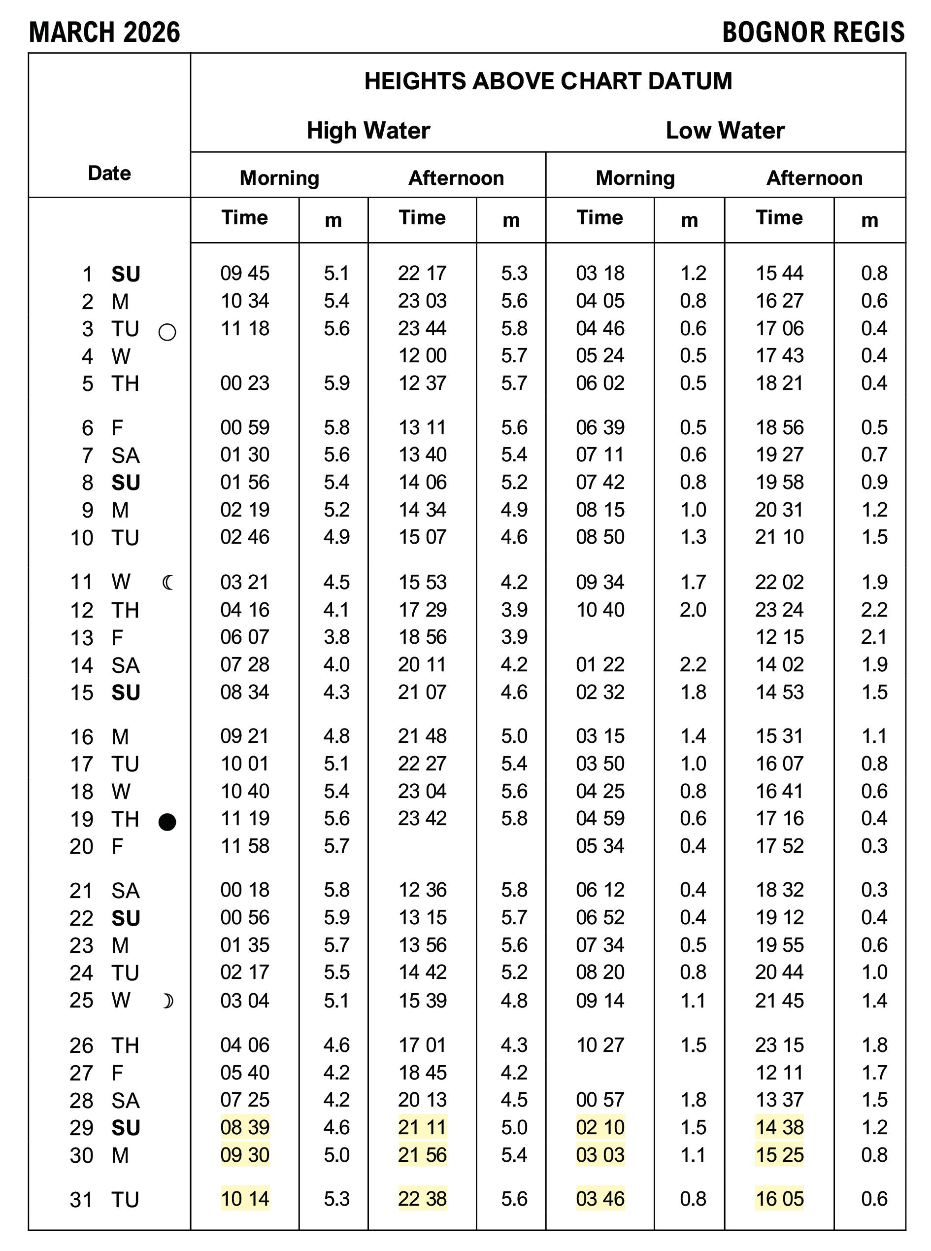 BOGNOR REGIS TIDE TABLE