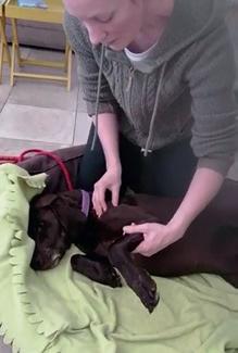 Colin is an 8 year old Dachshund who underwent spinal surgery for disc disease 2 months ago. Intervertebral disc disease is very common in this breed and leads to paralysis. Colin’s surgery has relieved pressure on the spinal cord and surrounding nerves allowing them to recover so that he will hopefully walk again. We are currently at the stage where he is starting to stand unsupported. I provide him with weekly laser treatment to aid the healing and a strict daily exercise regime to help him get strong again.