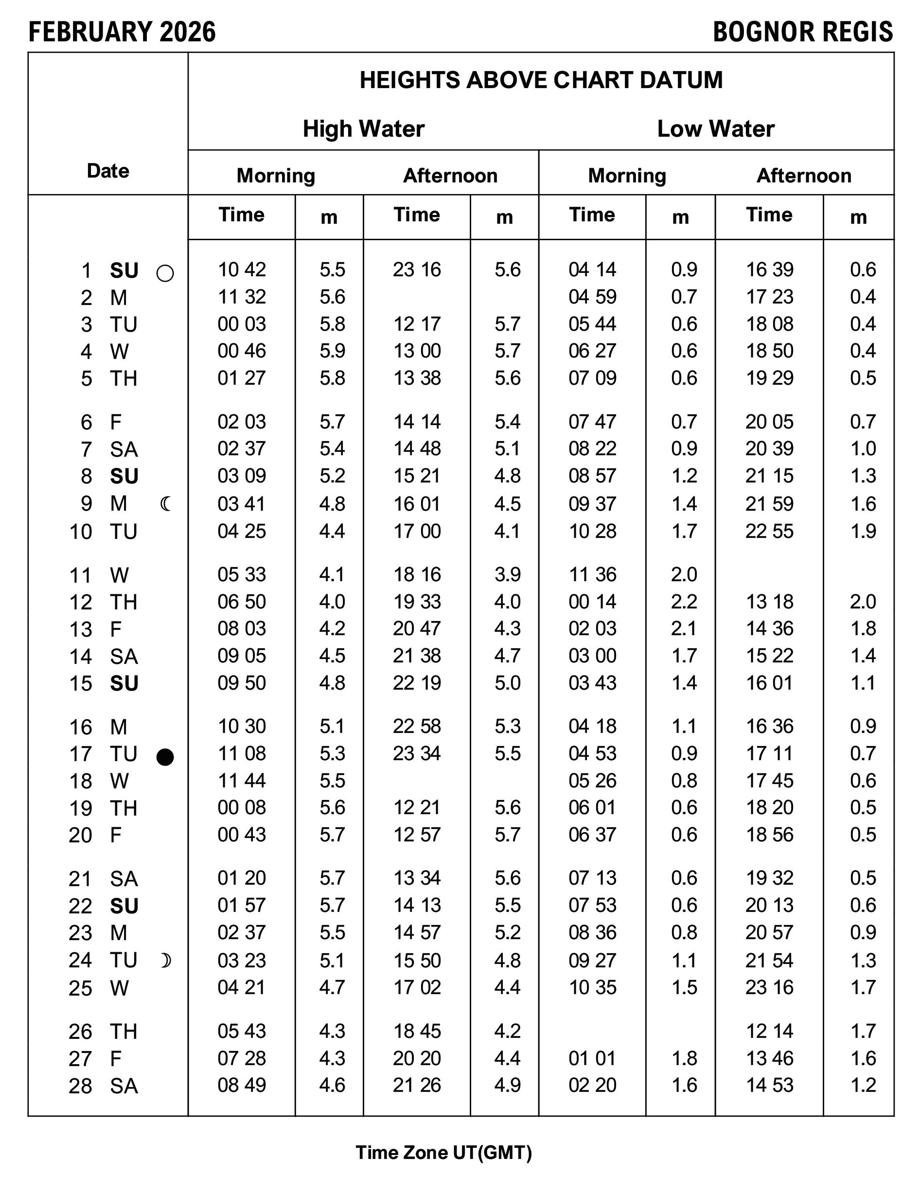 BOGNOR REGIS TIDE TABLE