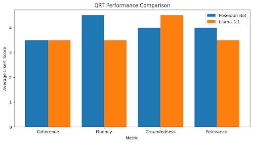 The Question Response Test was conducted with both Poseidon-Bot and a standard Llama model. The Poseidon-Bot responses averaged higher scores on ,luency, relevance, and similarity. Coherence remained approximately constant. Groundedness was scored as slightly lower in Poseidon-Bot’s response, dropping by 0.5, showing a slightly lower awareness of conversational context.