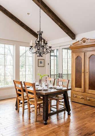 Custom-built as a dreamy retirement home in the mountains, the Fox Country Farmhouse is an exceptional example of craftsmanship. Among the design assests lending authenticity to this home’s farmhouse design are the stained and painted interior and exterior timber beam and accents, extensive hand-crafted woodwork created by our team of Master Carpenters, the large butler’s pantry with custom cabinetry and built-ins, custom double entry doors, free standing Owner’s Retreat bath tub and period sconce lighting, as well as metal roof accents, a custom sliding barn door, and knotty alder dutch door in the didning room.