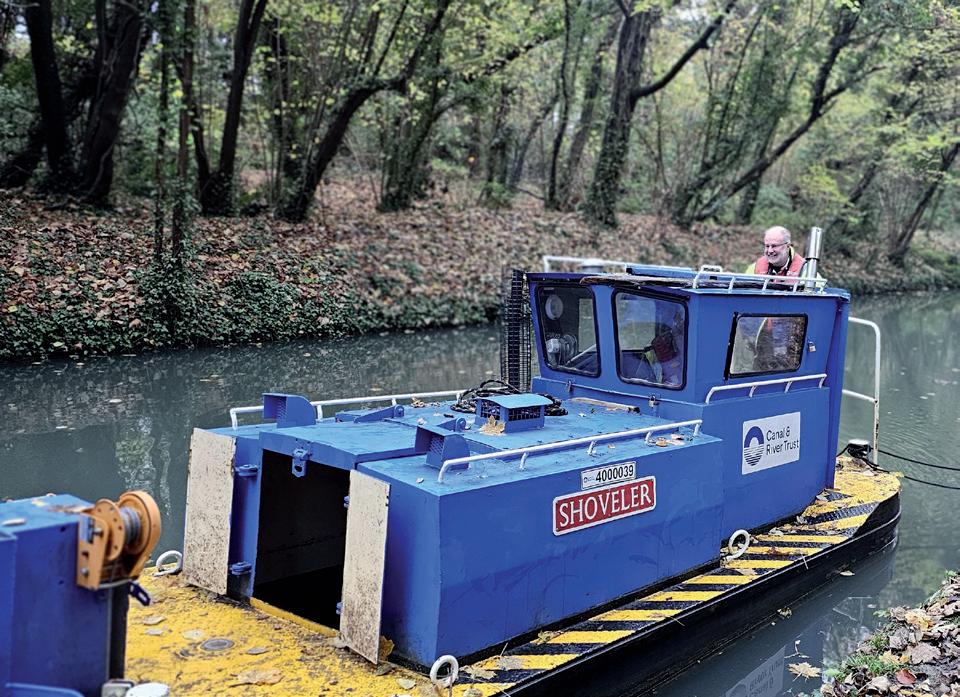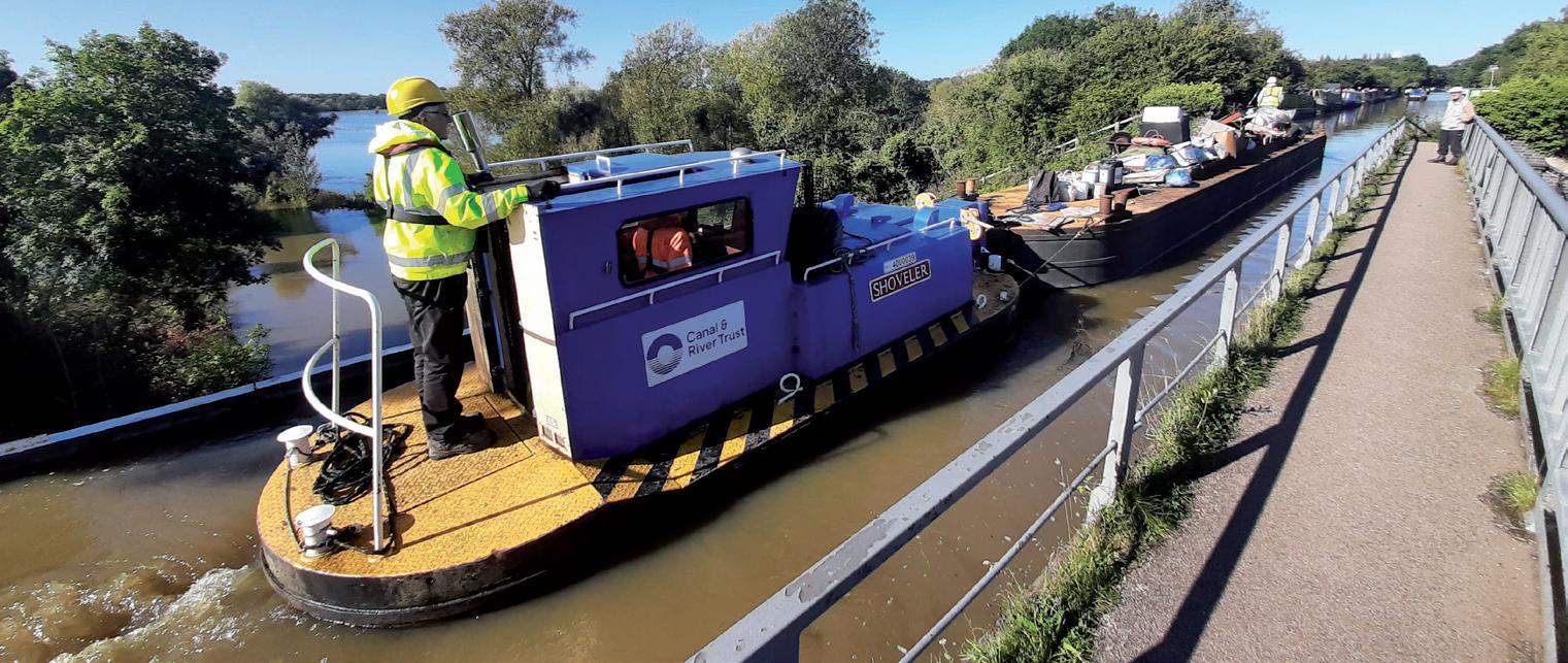 One of the matters which had not been satisfactorily resolved was Perseverance’s hydraulic drive, necessitating push-towing with tug Shoveler (below) which we had on loan from Canal & River Trust. Navigating with this combination calls for a substantial crew (above) as the steerer, in Shoveler’s low cabin, has very limited forward vision past Perseverance’s superstructure. It requires a crew member standing on the back of the tug to give directions and at least two people on the workboat (page 20, top) armed with large fenders to avoid impact with bridge holes, moored craft and the like. There was also a ‘ground crew’ travelling by van to set locks in advance, with the van