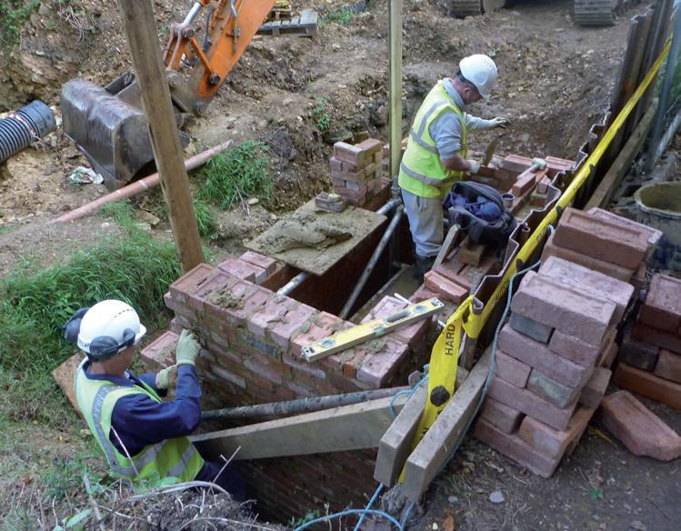 In the last issue I reported on the start of work on the water capture chamber, including digging out a base for the foundations and piling (above, at the back) to support the towpath and protect the construction works. Despite having to remove water at each session, the brickwork (above & below) for the chamber is now complete, including replacing the original degraded fifty year old pipe from the land drain (opposite). The project is now well on the way to completion, which will allow us to reinstate the clay lining which was cut through when the land drain was installed. It’s not just Buckingham Canal Society folk that have been involved; materials have been loaded and unloaded on site by corporate groups. For example, a team from Santander loaded, unloaded and stacked bricks, and even carried out much-needed vegetation clearance - those weeds do keep growing!