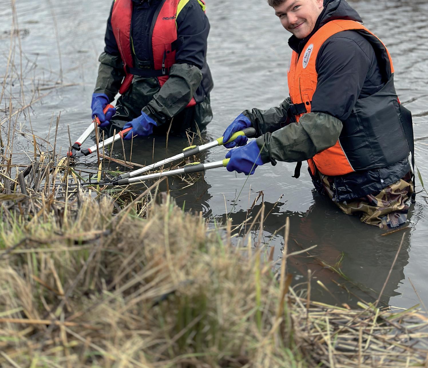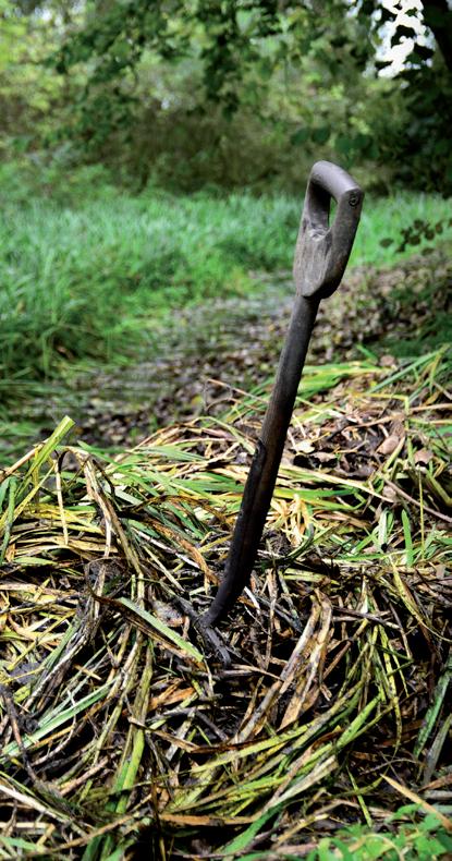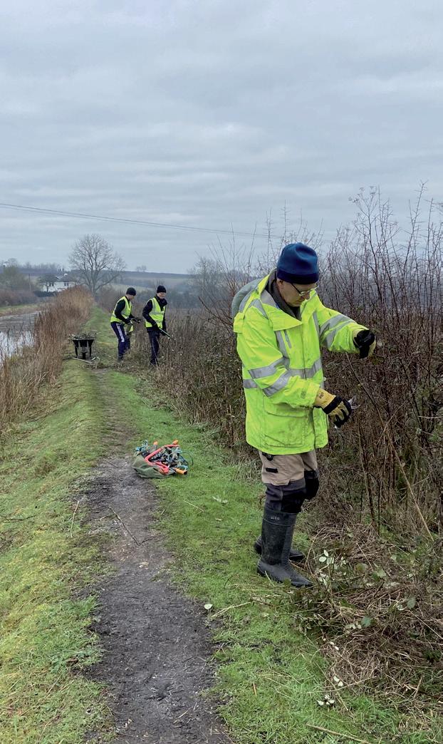 Buckingham Canal Society’s Green Gym is a relaxed and friendly environment where you can do as little or as much as you like. The sessions at Bourton Meadow involve doing a variety of jobs such as donning waders and getting into the canal to chop back reeds (opposite, bottom), or staying on dry land and maintaining hedges (opposite, top) or cutting back brambles and other weeds. These activities require light to moderate effort and involve tasks like pushing wheelbarrows, lifting and carrying, using equipment like loppers, shears, rakes and mattocks. I find these activities help improve mobility, flexibility and support general fitness levels.
