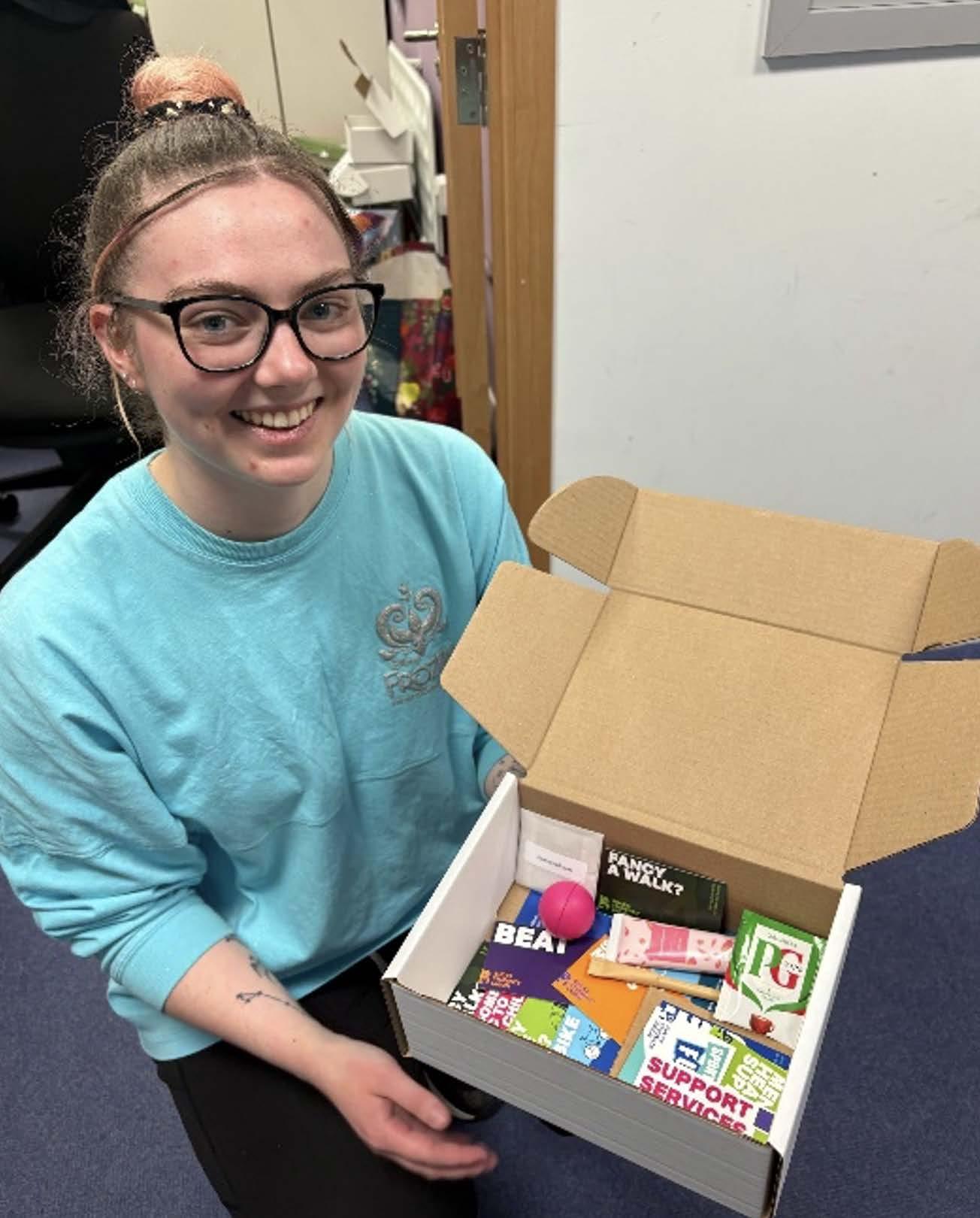 As part of this campaign, we have created wellbeing kits to support you. These boxes contain self-help technique cards, support service cards, Epsom bath salts, hand cream, a hot beverage sachet, mini notebook, pen, and a mini stress ball. The boxes themselves are also a technique as you can decorate this kit to make it yours. You can draw, doddle and design these boxes so that this box is completely yours. You can also personalise the kit by adding in your own items after collecting a box from the SU.
