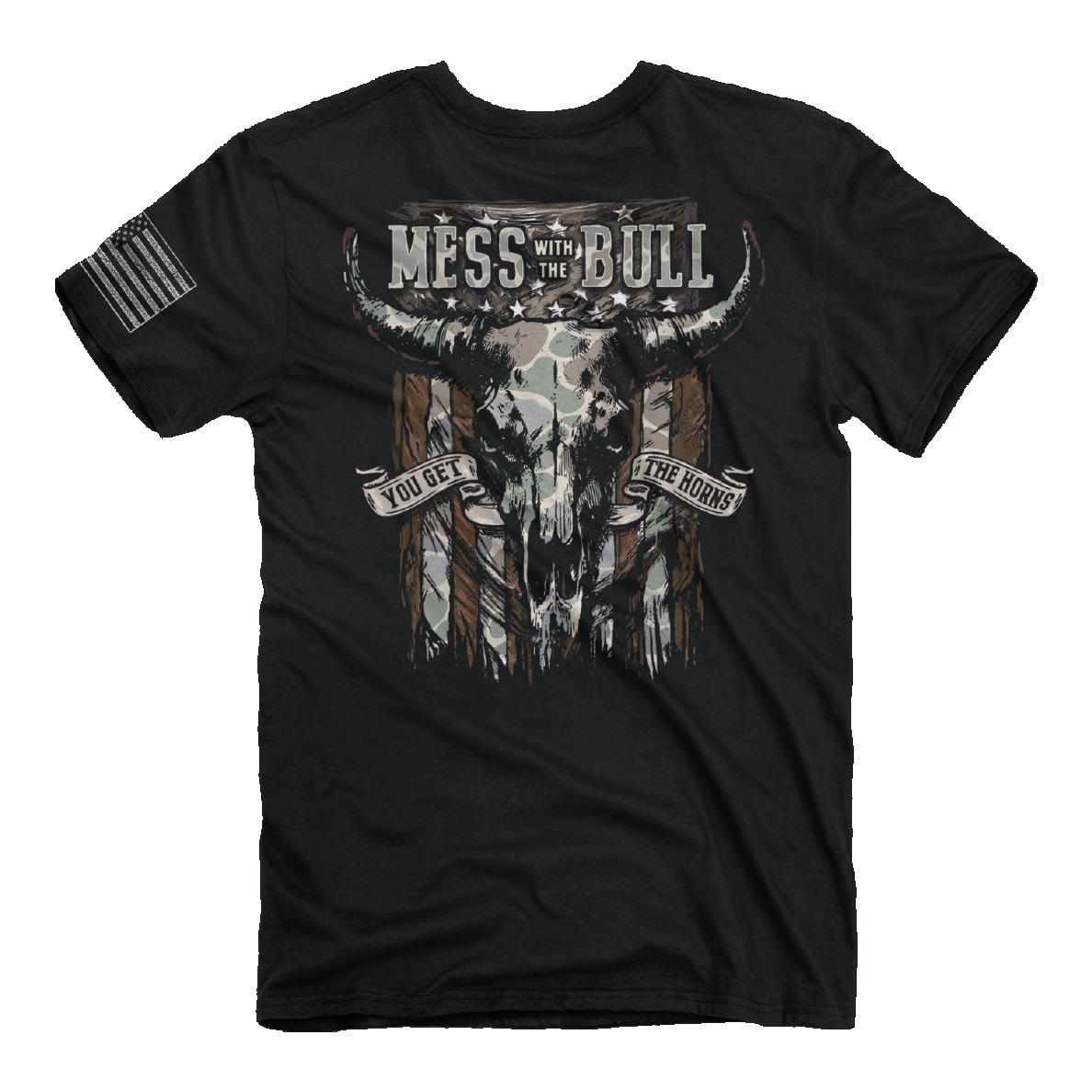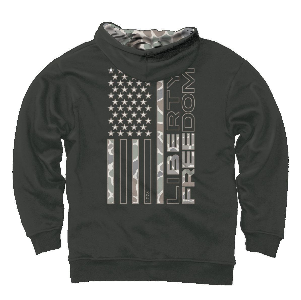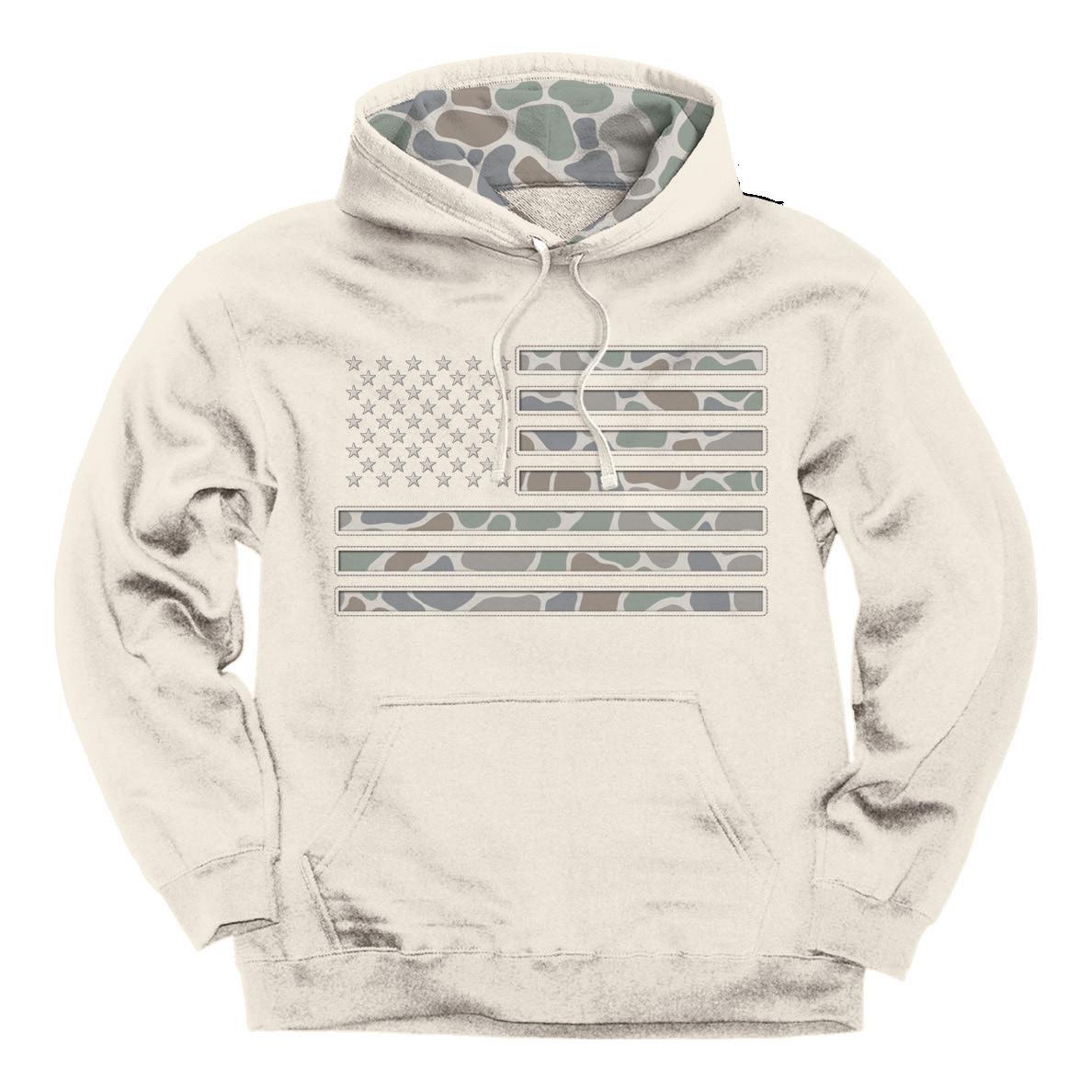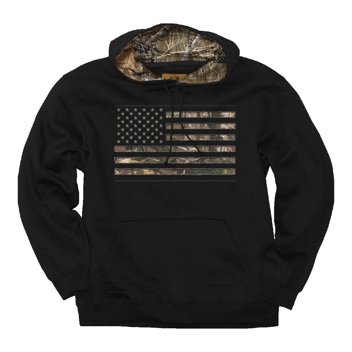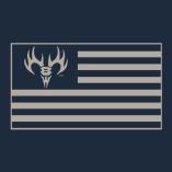 Applique skull and American, embroidered text, screen-printed stars, Realtree camo accents