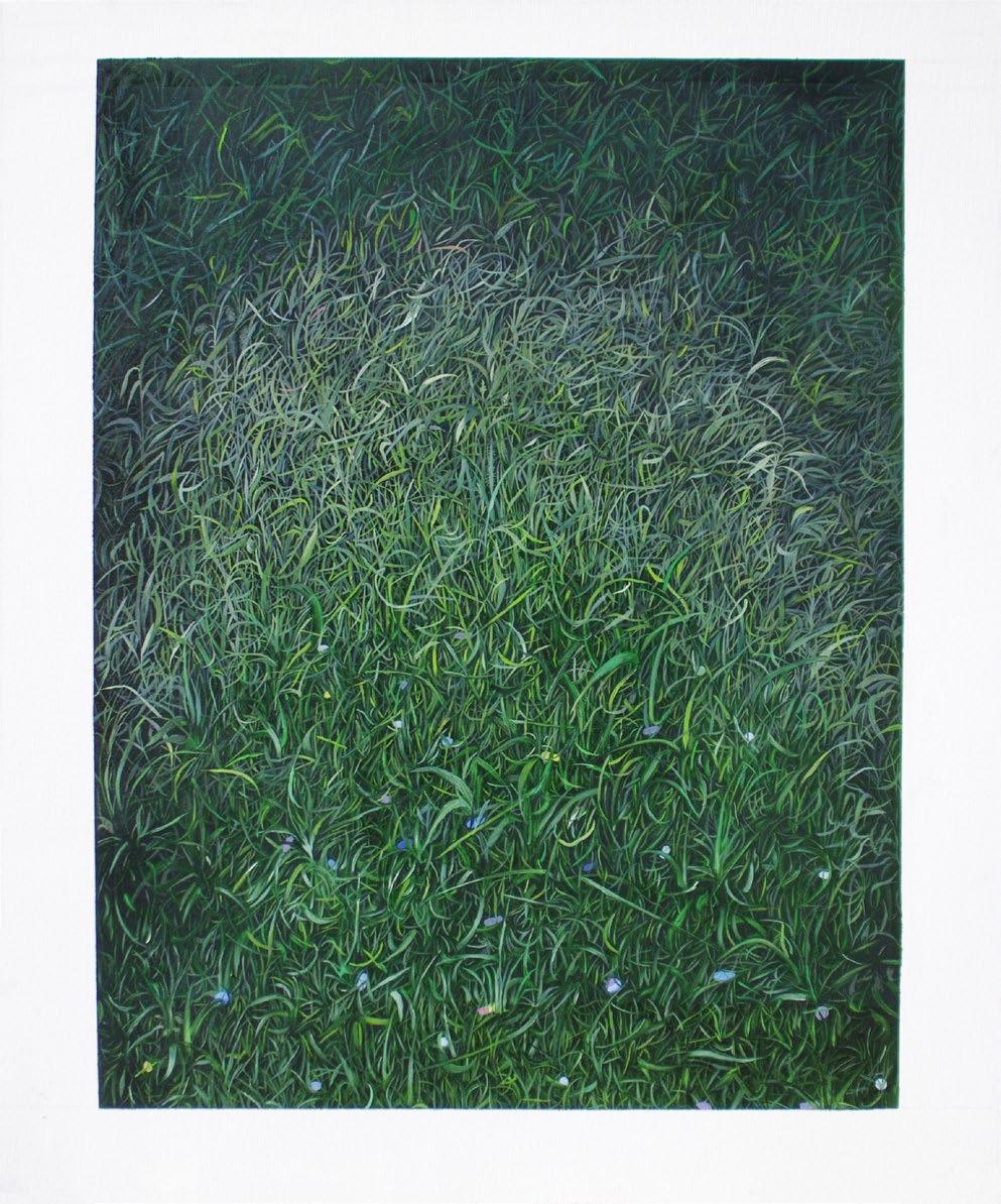 Rácz Noémi képei a rend és a burjánzás határán egyensúlyoznak: ott, ahol a geometria fegyelme találkozik az élő struktúrák véletlenszerűségével. A fű, a gyep, a rovar, a kicsiny dolgok világa nem témaként van jelen, hanem a festmények belső szervezője.