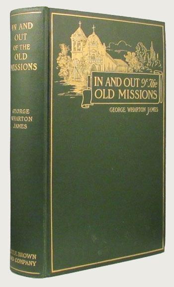 93 James, George Wharton. IN AND OUT OF THE OLD MISSIONS OF CALIFORNIA An Historical and Pictorial Account of the Franciscan Missions (Boston: Little, Brown, and Company, 1907) First Edition, reissued. INSCRIBED PRESENTATION COPY SIGNED BY THE AUTHOR. With 142 fine illustrations from black and white photographs reproduced on glossy plates. Large 8vo, publisher’s very pretty original binding of ribbed green cloth, the upper cover gilt lettered and decorated with an image of a California Mission in gilt within a gilt frame, the spine gilt lettered and gilt ruled at the tips, t.e.g. xx, 392, [2 ads] pp. An exceptional copy, very fine and bright and near as mint.