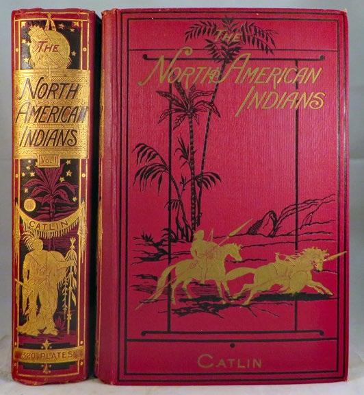 89 Catlin, George. THE NORTH AMERICAN INDIANS: Being Letters and Notes on Their Manners, Customs, and Conditions, Written During Eight Years’ Travel Amongst the Wildest Tribes of Indians in North America, 1832-1839. (Edinburgh: John Grant, 1926) 2 volumes. First edition thus, first with the colour plates issued by Grant, in the 1903 imprint the illustrations were supplied only in black and white. With 320 illustrations in colour, carefully engraved from the author’s original paintings and including 3 colour maps, one of which is folding. Thick royal 8vos, publisher’s original red cloth lettered and elaborately and pictorially decorated in gilt and black on both the upper covers and the spines featuring Indian warriors, t.e.g.. ix, 298; ix, 290, appendices pp. A very handsome, well preserved, fine and bright set, the gilt and cloth, textblock and colour plates, all in very pleasing condition.
