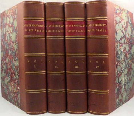 88 Buckingham, J. S. AMERICA. Historical, Statistic, and Descriptive (London: Fisher, Son, & Co., [1841]) 3 volumes. First Edition. With engraved frontispiece portrait, numerous engraved two page illustrations, a great profusion of engravings within the text and a fine folding map. 8vo, very handsomely bound by Bayntun of Bath, England in polished mottled tan calf, the spine panels intricately gilt in compartments separated by raised bands, central gilt ornamental devices of American eagles within the elaborately gilt panels, two compartments with citron lettering labels gilt, the covers all richly gilt with gilt tooled borders and elaborate corner pieces in gilt, top edges gilt, gilt tooled board edges, turnovers richly gilt, marbled endleaves. xvi, 504; [viii] 563; [xii], 596, index. A very fine and handsome set, beautifully bound, with just a slight bit of rubbing to the extremities, and some light evidence of age. A beautiful set.