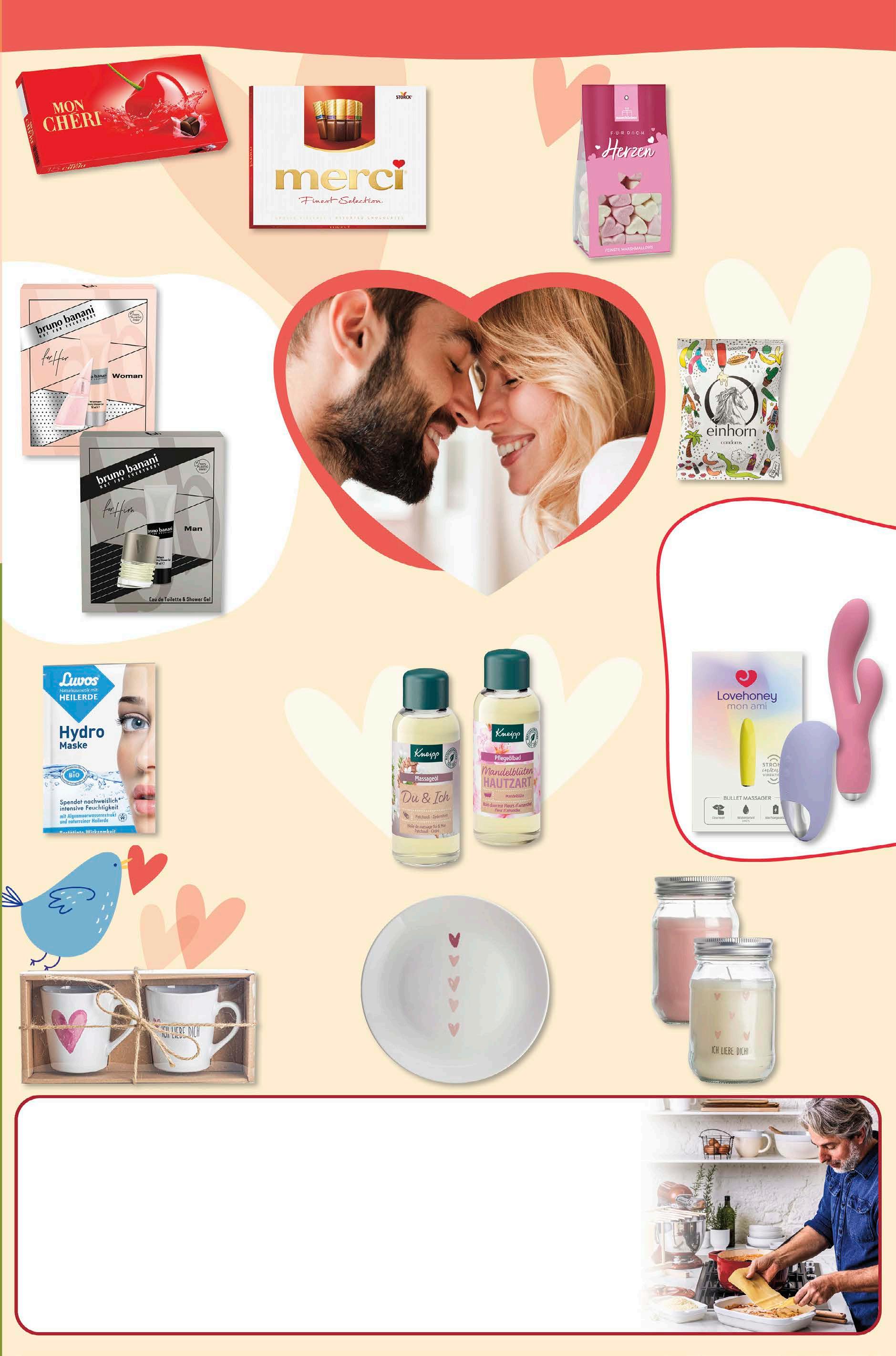 liebe verschenken Naschlabor Marshmallow versch. Sorten 100/90 g 1 kg = 25,50/28,33 2,55 aktion Mon Cheri 157 g 1 kg = 11,97 1,88 -41% UVP 3,19 Merci versch. Sorten 250 g 1 kg = 8,88 2,22 -35% UVP 3,39 Einhorn Kondome versch. Sorten vegan 7 Stück 4,99 -17% UVP 6,00 Bruno Banani Man oder Woman Geschenk-Set 10,99 -31% UVP 15,99 Luvos HydroMaske 2x 7,5 ml 1 l = 66,00 0,99 -23% UVP 1,29 Kneipp Massageöl versch. Sorten 100 ml 1 l = 59,90 5,99 -25% UVP 7,99 Kneipp Badezusatz versch. Sorten 100 ml 1 l = 39,90 3,99 -20% UVP 4,99 Eau de Toilette 30 ml + Duschgel 50 ml