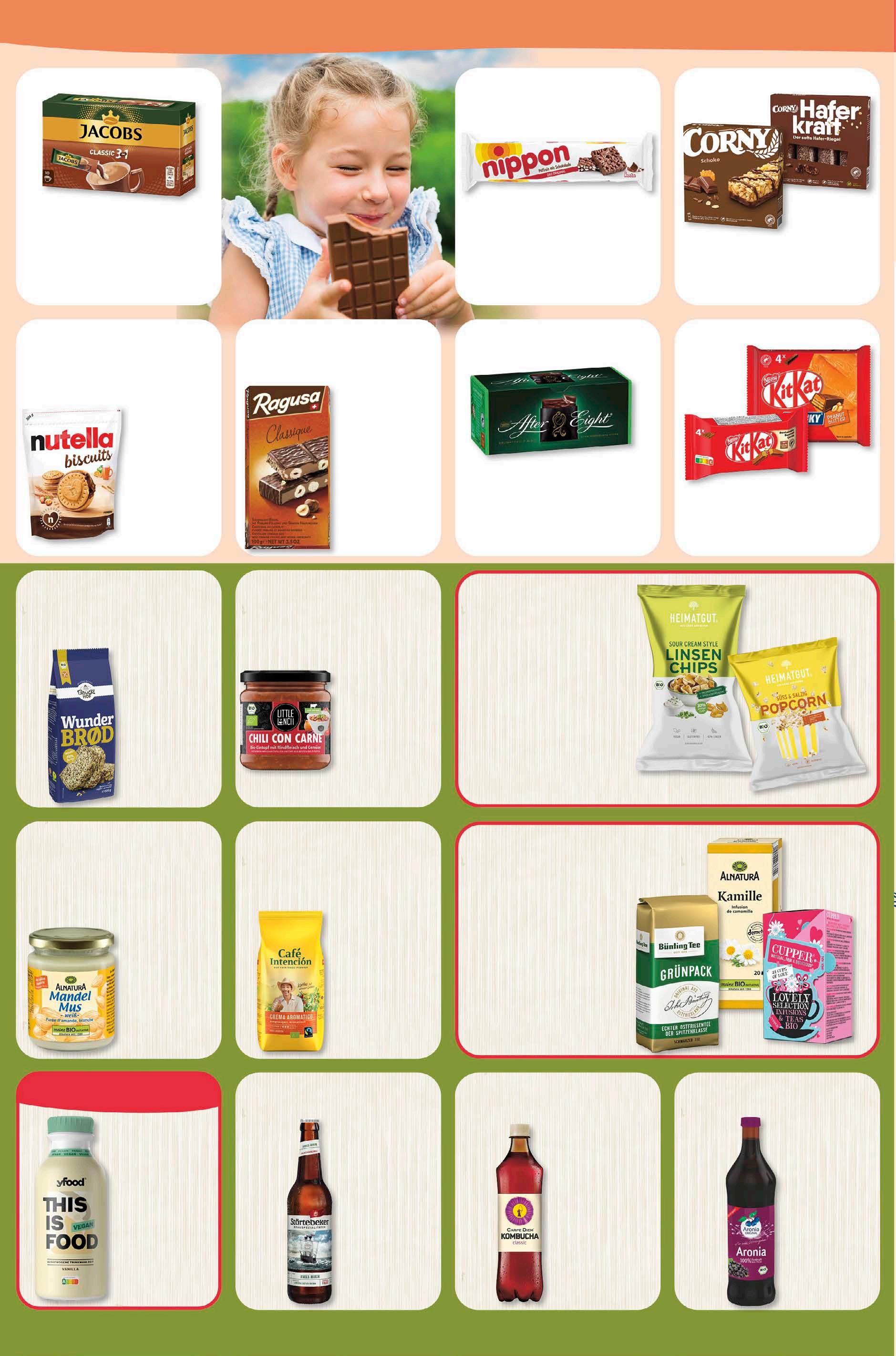 Bauckhof Wunderbröd 600 g 1 kg = 6,65 3,99 -11% UVP 4,49 Alnatura Mandelmus weiß vegan 250 g 1 kg = 23,96 5,99 -14% UVP 6,99 Aronia Direktsaft 700 ml 1 l = 7,13 4,99 -23% UVP 6,49 genuss Abgabe in haushaltsüblichen Mengen. Café Intención Crema Aromatico vegan 1 kg 12,99 -32% UVP 18,99 Nutella Biscuits 304 g 1 kg = 8,19 2,49 -17% UVP 2,99 After Eight Classic 200 g 1 kg = 7,45 1,49 -25% UVP 1,99 Nippon Häppchen 200 g 1 kg = 4,95 0,99 -43% UVP 1,75 Corny Riegel versch. Sorten 150 g 1 kg = 6,60 0,99 -45% UVP 1,79 Ragusa Classique Schokolade 100 g 1 kg = 19,90 1,99 -20% UVP 2,49 Kit Kat Riegel oder Chunky 168/166 g 1 kg = 8,87/8,98 1,49 -25% UVP 1,99 Little Lunch versch. Sorten 350 g 1 kg = 7,11 2,49 aktion 20% rabatt auf alle artikel von heimatgut. 20% rabatt auf tee. Carpe Diem Komucha Classic zzgl. 0,25 € Pfand Gesamtpr. 2,47 € 750 ml 1 l = 2,96 2,22 -26% UVP 2,99 Störtebeker Bier versch. Sorten zzgl. 0,08 € Pfand Gesamtpr. 0,97 € 500 ml 1 l = 1,78 0,89 -18% UVP 1,09 Yfood Trinkmahlzeit versch. Sorten vegan 500 ml 1 l = 5,98 2,99 -25% UVP 3,99 knaller-preis Jacobs Kaffee Instant Getränk versch. Sorten 180 g 1 kg = 9,94 1,79 -22% UVP 2,29