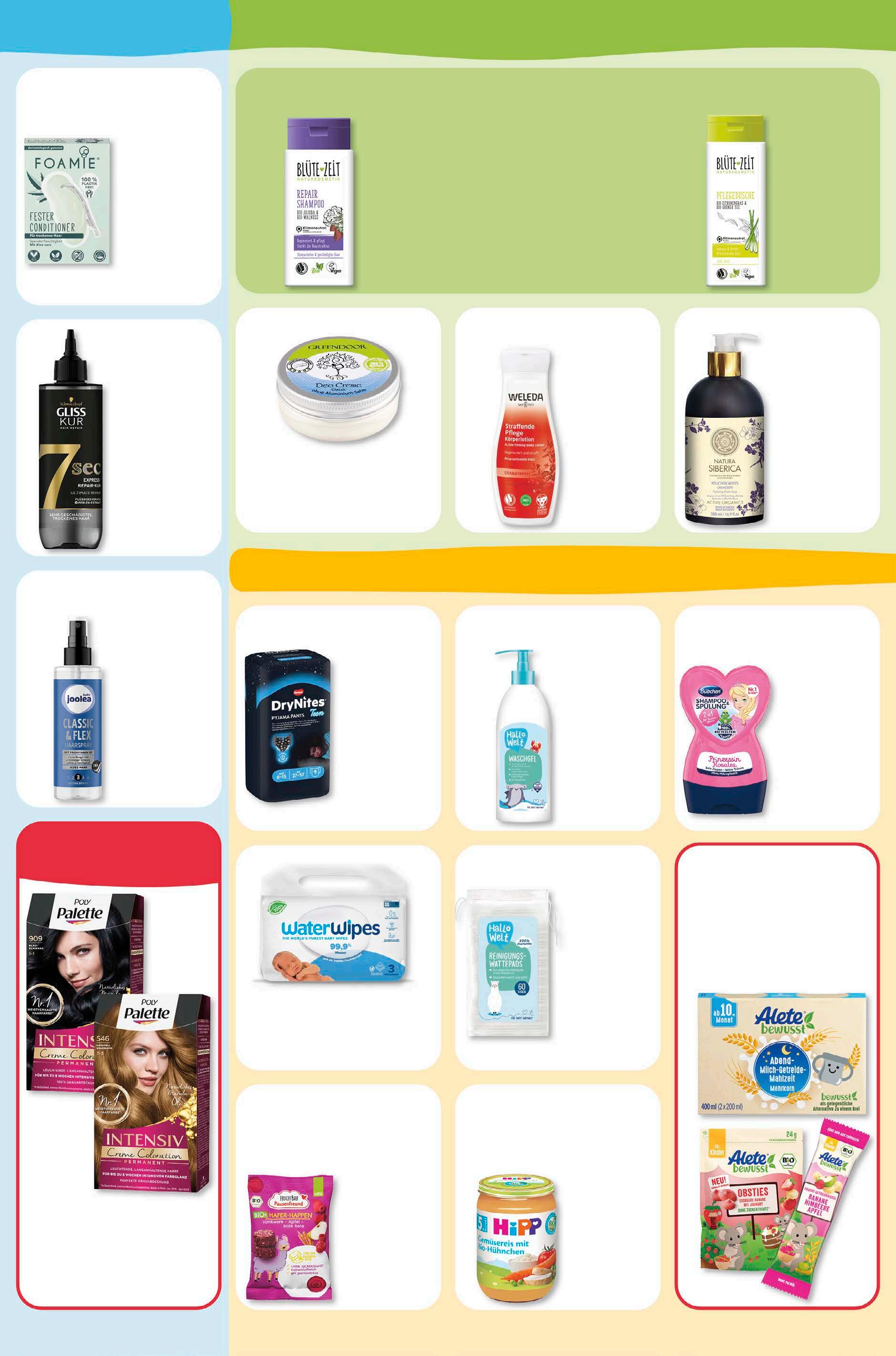 baby & kind naturkosmetik Hallo Welt Waschgel vegan 500 ml 1 l = 3,58 1,79 -25% 2,39 Hallo Welt Reinigungswattepads 60 Stück 1,19 -30% 1,69 budni marke budni mark Bübchen Shampoo & Duschgel versch. Sorten vegan 230 ml 1 l = 6,04 1, 39 -26% UVP 1,89 5,99 -28% UVP 8,29 Foamie Feste Spülung versch. Sorten vegan 80 g 1 kg = 49,88 3,99 -19% UVP 4,95 Huggies Dry Nites Pants versch. Größen 9 Stück Greendoor Deo Creme vegan 50 ml 1 l = 125,80 6,29 -21% UVP 7,95 Natura Siberica FeuchtigkeitsCremeseife versch. Sorten 500 ml 1 l = 9,98 4,99 -29% UVP 7,00 Weleda Körperlotion versch. Sorten 200 ml 1 l = 64,95 12,99 -23% UVP 16,95 budni marke pflege, die mit der natur im reinen ist. Blüte-Zeit Shampoo versch. Sorten vegan 200 ml 1 l = 7,45 1,49 -25% 1,99 Blüte-Zeit Duschgel versch. Sorten vegan 250 ml 1 l = 5,16 1,29‡ -13% 1,49 budni marke Waterwipes Baby Feuchttücher 180 Stück 7,99 -20% UVP 9,99 Fruchtbar Pausenfreund versch. Sorten vegan 80 g 1 kg = 21,13 1,69 -15% UVP 1,99 Hipp Menü ab 5. Monat versch. Sorten 190 g 1 kg = 6,26 1,19 -30% UVP 1,69 20% rabatt auf alle artikel von alete. knaller-preis Poly Palette Intensiv Creme Coloration versch. Farben Packung 2,44 -18% UVP 2,99 Gliss Kur 7 Sekunden Haarkur versch. Sorten 200 ml 1 l = 24,95 4,99 -17% UVP 5,99 Joolea Haarspray versch. Sorten 150 ml 1 l = 7,93 1,19 -20% 1,49 ‡ budni marke