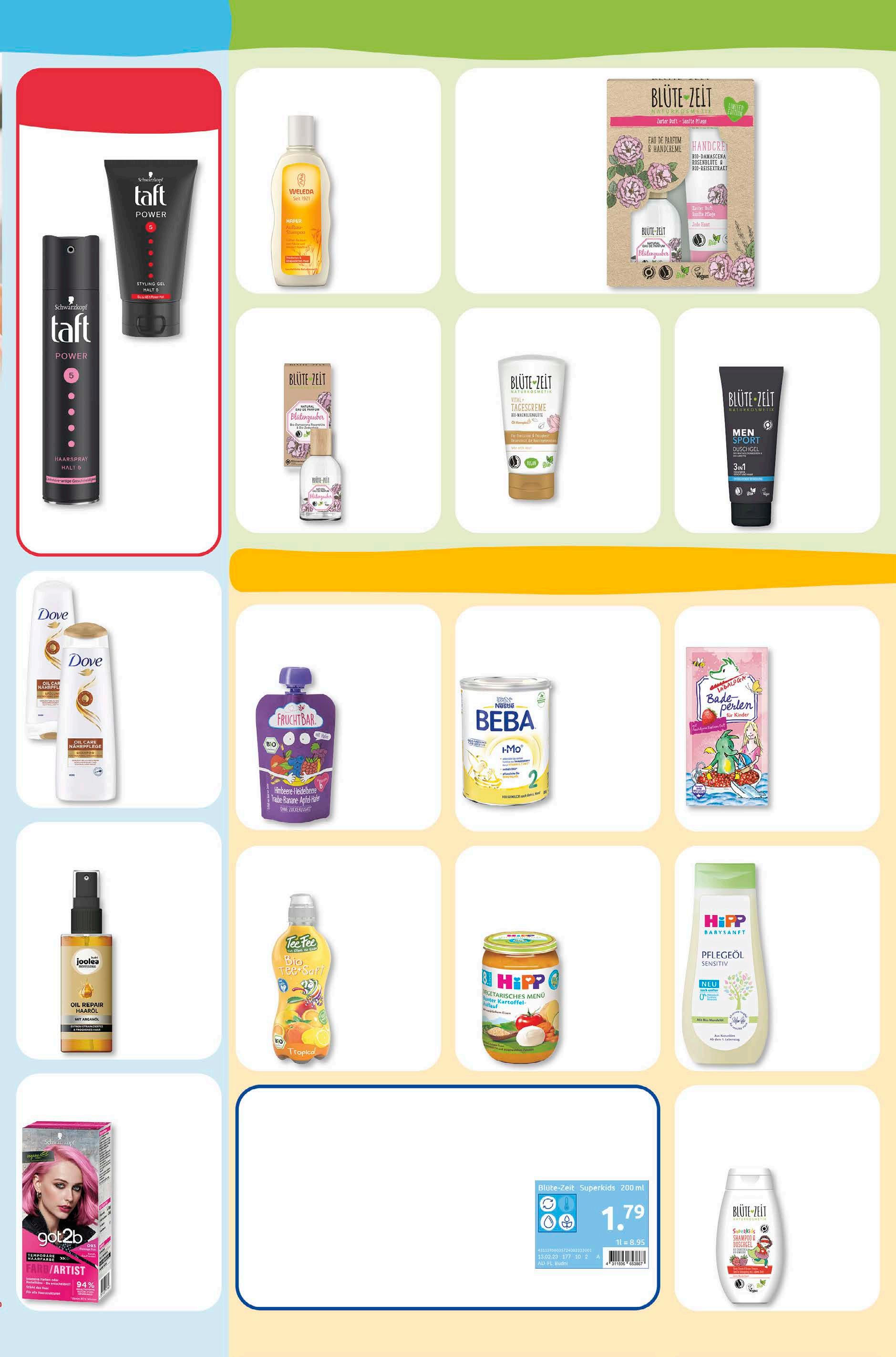 Taft Haarstyling versch. Sorten vegan 250/150 ml 1 l = 8,88/14,80 2,22 -26% UVP 2,99 Blüte-Zeit Superkids Duschgel & Shampoo versch. Sorten 200 ml 1 l = 8,95 1,79‡ -10% 1,99 budni marke