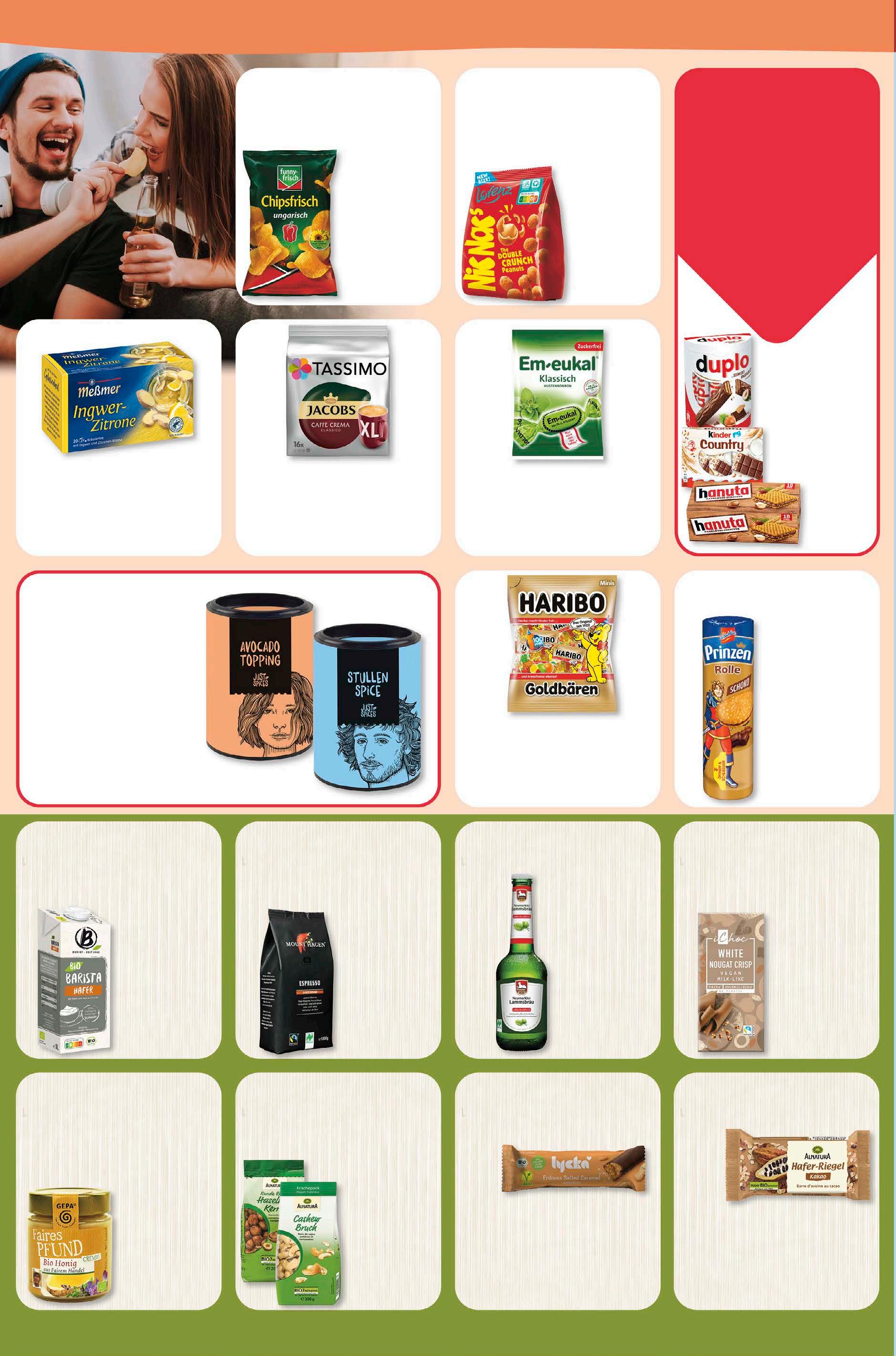 genuss Prinzen Rolle Schoko 400 g 1 kg = 2,78 1,11 -44% UVP 1,99 Em-eukal Bonbons zuckerfrei versch. Sorten 75 g 1 kg = 21,20 1,59 -11% UVP 1,79 Haribo Minis versch. Sorten 250 g 1 kg = 5,96 1,49 -25% UVP 1,99 Funny-frisch Chipsfrisch versch. Sorten 150 g 1 kg = 6,60 0,99 -50% UVP 1,99 Nic Nacs Original 110 g 1 kg = 9,00 0,99 -48% UVP 1,89 Meßmer Tee versch. Sorten 20x 2 g 1 kg = 34,75 1, 39 -30% UVP 1,99 Tassimo Jacobs Kaffeepads versch. Sorten 132,8/264 g 1 kg = 28,54/14,36 3,79 -35% UVP 5,79 20% rabatt auf alle artikel von just spices. Duplo, Hanuta, Kinder Riegel oder Country 182/220/ 210/211,5 g 1 kg = 10,93/9,05/ 9,48/9,41 1,99 -23% UVP 2,59 dienstag happy deal am 1,49 UVP 2,59 -42% 1 kg = 8,19/6,77/ 7,10/7,04 Lammsbräu Alkoholfrei versch. Sorten zzgl. 0,08 € Pfand Gesamtpr. 1,07 € 330 ml 1 l = 3,00 0,99 -23% UVP 1,29 Ichoc Schokolade versch. Sorten vegan 80 g 1 kg = 21,13 1,69 -26% UVP 2,29 Mount Hagen Espresso ganze Bohne versch. Sorten vegan 1 kg 14,99 -25% UVP 19,99 Berief Barista Hafer Dink versch. Sorten vegan 1 Liter 1,49 -25% UVP 1,99 Alnatura Haferriegel versch. Sorten 60 g 1 kg = 16,50 0,99 -29% UVP 1,39 Lycka Schokoriegel versch. Sorten vegan 40 g 1 kg = 24,75 0,99 -23% UVP 1,29 Gepa Faires Pfund Honig 500 g 1 kg = 10,98 5,49 -15% UVP 6,49 Alnatura Paranusskerne, Haselnusskerne oder Cashewbruch 200/300 g 1 kg = 17,45/11,63 3,49 aktion
