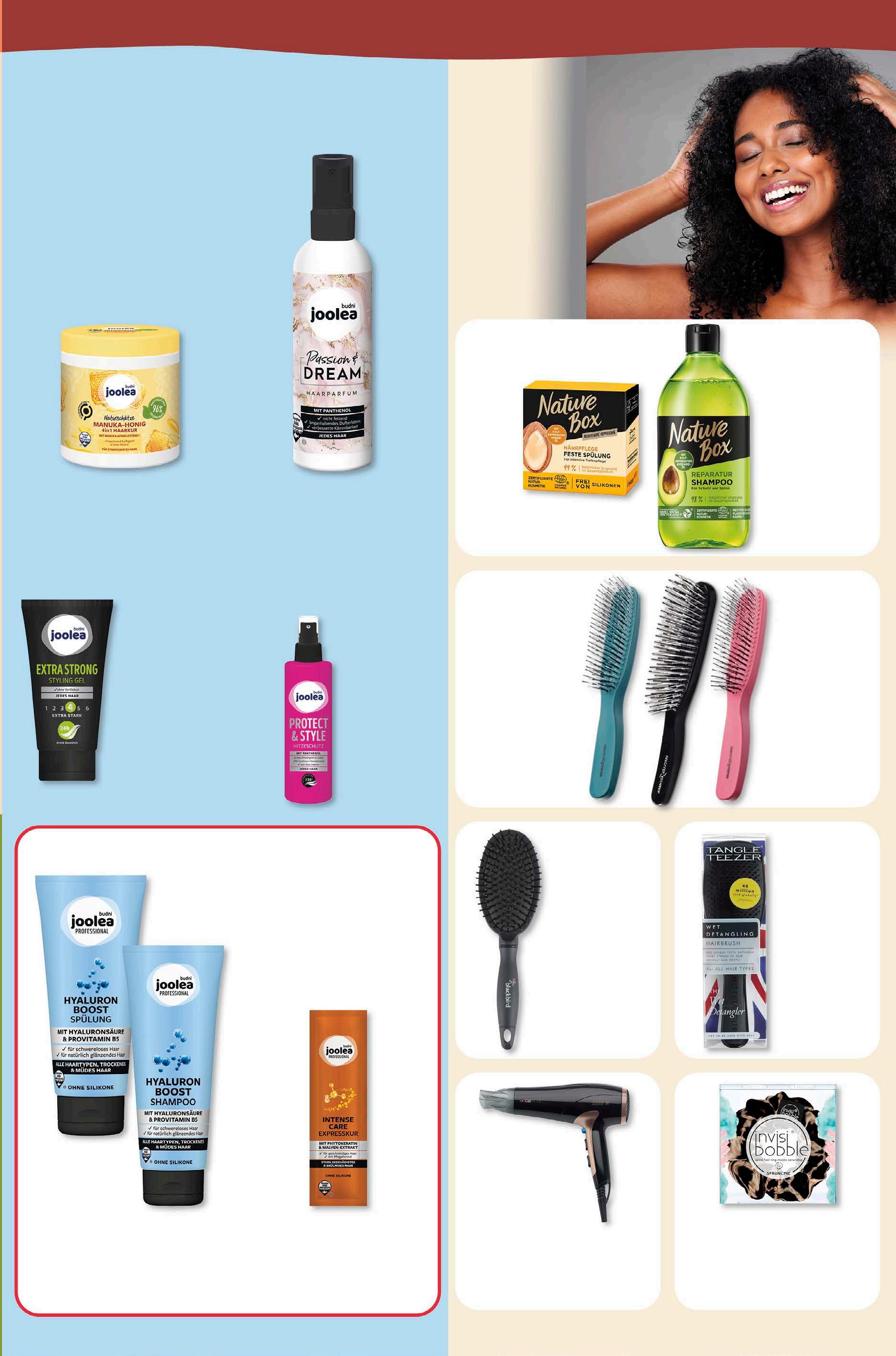 Joolea Styling Gel versch. Sorten vegan 150 ml 1 l = 8,60 1,29 -19% 1,59 ‡ budni marke ‡ Gleichzeitig günstigster Gesamtpreis der letzten 30 Tage. Abgabe in haushaltsüblichen Mengen. Joolea Hitzeschutz Spray vegan 250 ml 1 l = 6,36 1,59 -20% 1,99 ‡ budni marke deine pflege für jeden tag. budni marke Joolea Professional Shampoo oder Spülung versch. Sorten 250/200 ml 1 l = 5,96/7,45 1,49 aktion gratis1 kaufe joolea professional shampoo & spülung und erhalte joolea expresskur 20 ml gratis. + 1 Sortiere selbst. Alle Artikel mit zur Kasse nehmen. hairliche angebote 17,99 aktion Hercules Zauberbürste versch. Farben Stück Die besonderen Nylonpins ermöglichen perfektes Entwirrenganz ohne Reißen und Ziepen. 13,99 aktion Tangle Teezer The Wet Detangler Haarbürste Stück 3,99 aktion Blackbird Haarbürste Stück budni marke 12,99 aktion Clatronic HT 3661 Haartrockner Ionic 2200 Watt Stück 3,99 aktion Invisibobble Sprunchie Purrfection Haargummi Stück Joolea Naturschätze Haarkur 4in1 250 ml 1 l = 9,96 2,49 -16% 2,95 ‡ budni marke Nature Box Shampoo oder Feste Spülung versch. Sorten vegan 385 ml/80 g 1 l/kg = 8,55/41,13 3,29 -34% UVP 4,99 Batiste Trockenshampoo versch. Sorten 200 ml 1 l = 14,95 2,99 -25% UVP 3,99 Joolea Haarparfüm vegan 100 ml 1 l = 19,90 1,99 -20% 2,49 ‡ budni marke
