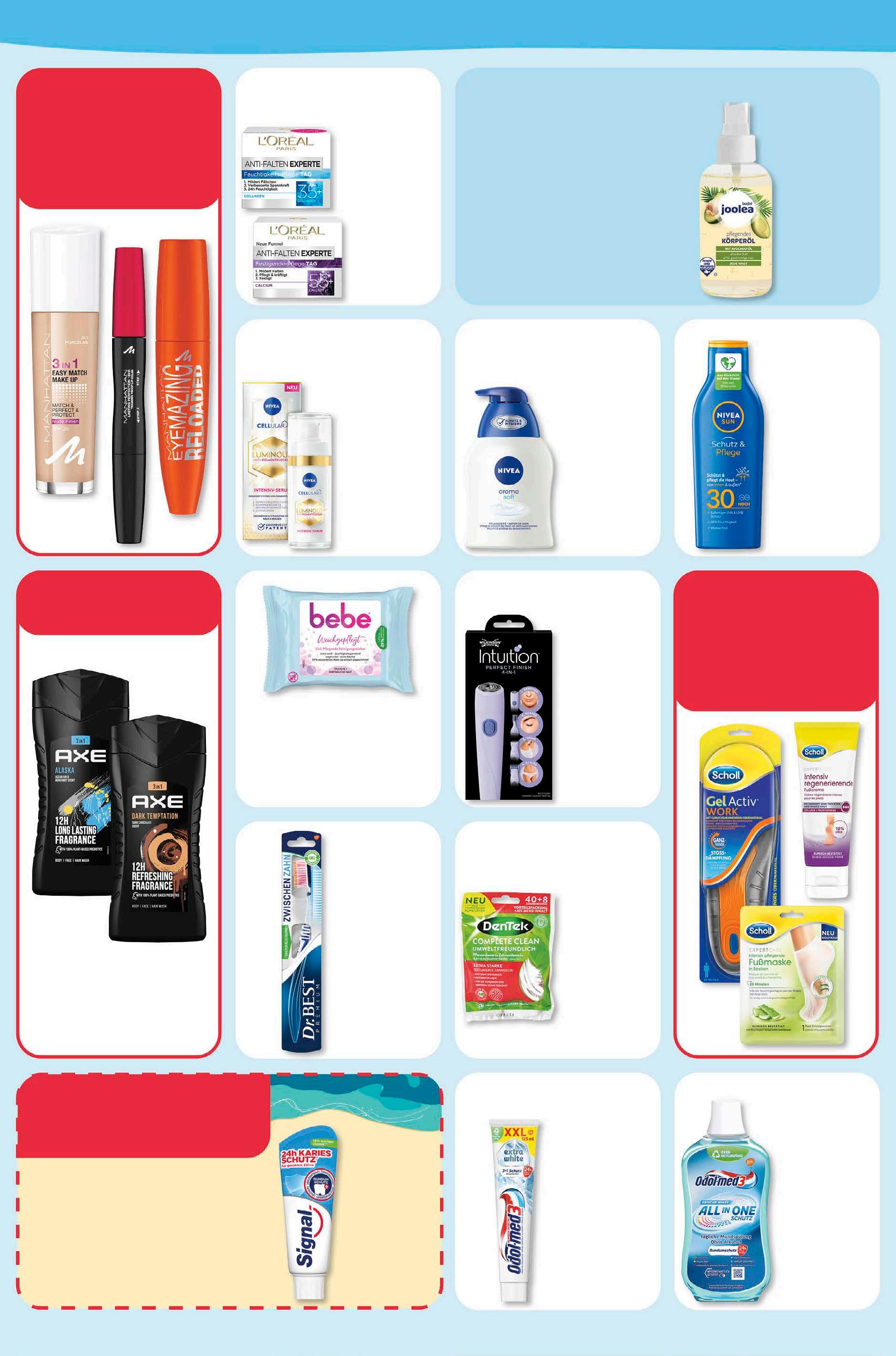 L’Oréal Anti Falten Expert Tages- oder Nachtpflege versch. Sorten 50 ml 1 l = 75,80 3,79 -24% UVP 4,99 Nivea Seife versch. Sorten 250 ml 1 l = 5,16 1,29 -44% UVP 2,29 Axe Duschgel versch. Sorten 250 ml 1 l = 7,52 1,88 -24% UVP 2,49 Bebe Reinigungstücher versch. Sorten 25 Stück 1,99 -20% UVP 2,49