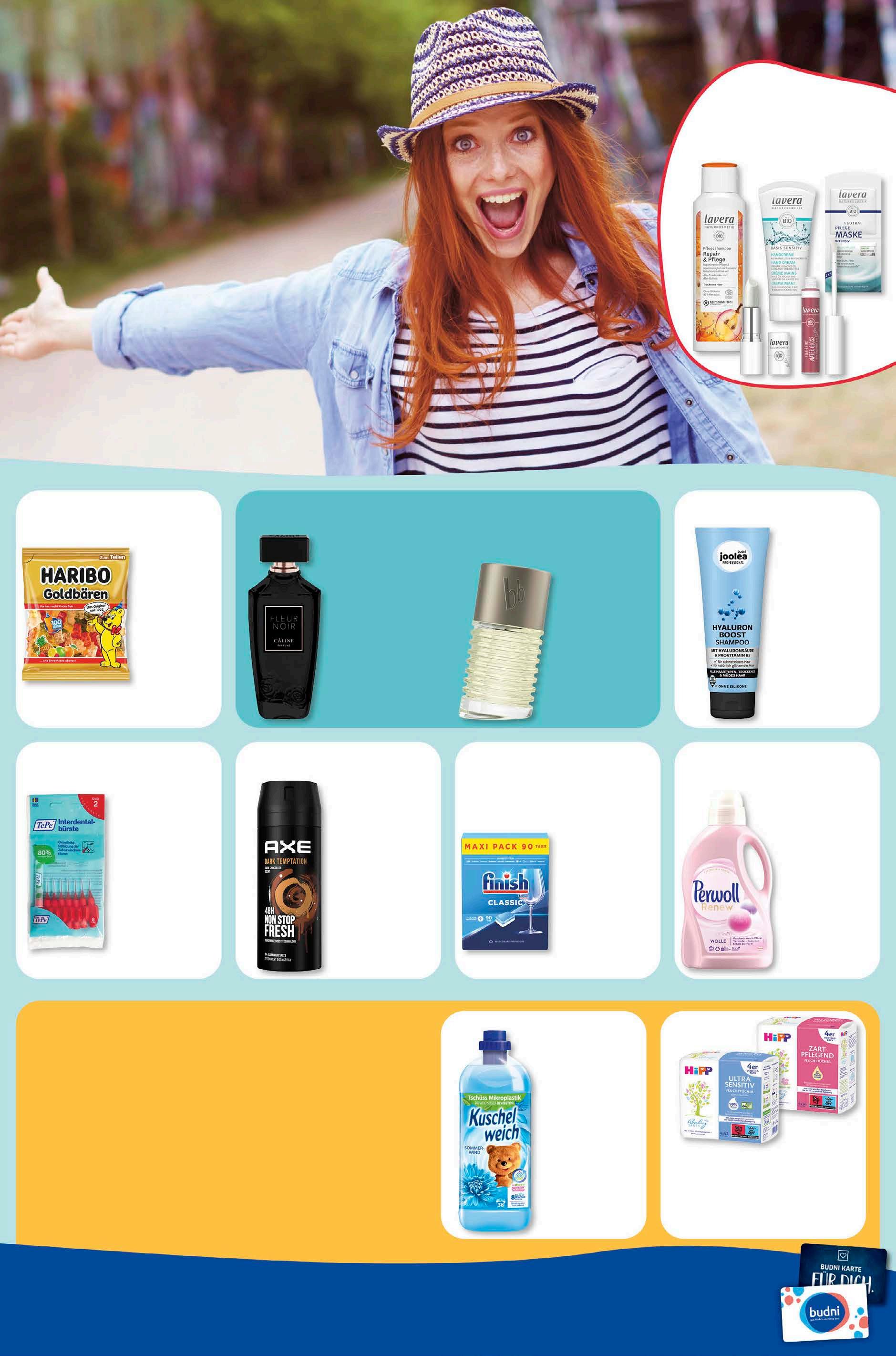 Perwoll Waschmittel versch. Sorten 20 WL 1 WL = 0,17 3, 33 -30% UVP 4,79 Finish Maxi Pack Spülmaschinen-Tabs 90 WL 1 WL = 0,09 7,77 -22% UVP 9,99 Joolea Professional Shampoo oder Spülung versch. Sorten 250/200 ml 1 l = 5,32/6,65 1, 33 -11% 1,49 ‡ budni marke Haribo versch. Sorten 175/160 g 1 kg = 3,77/4,13 0,66 -39% UVP 1,09 Axe Deo Spray versch. Sorten 150 ml 1 l = 14,80 2,22 -41% UVP 3,79 Câline Fleur Noir Eau de Parfum versch. Sorten 60 ml 4,44 -32% UVP 6,49 Bruno Banani Man Eau de Toilette 50 ml 12,12 -39% UVP 19,99 TePe Interdentalbürsten versch. Sorten Packung 3, 33 -29% UVP 4,69 22% rabatt auf alle artikel von lavera. Kuschelweich Weichspüler versch. Sorten 38 WL 1 WL = 0,03 1,29 -35% UVP 1,99