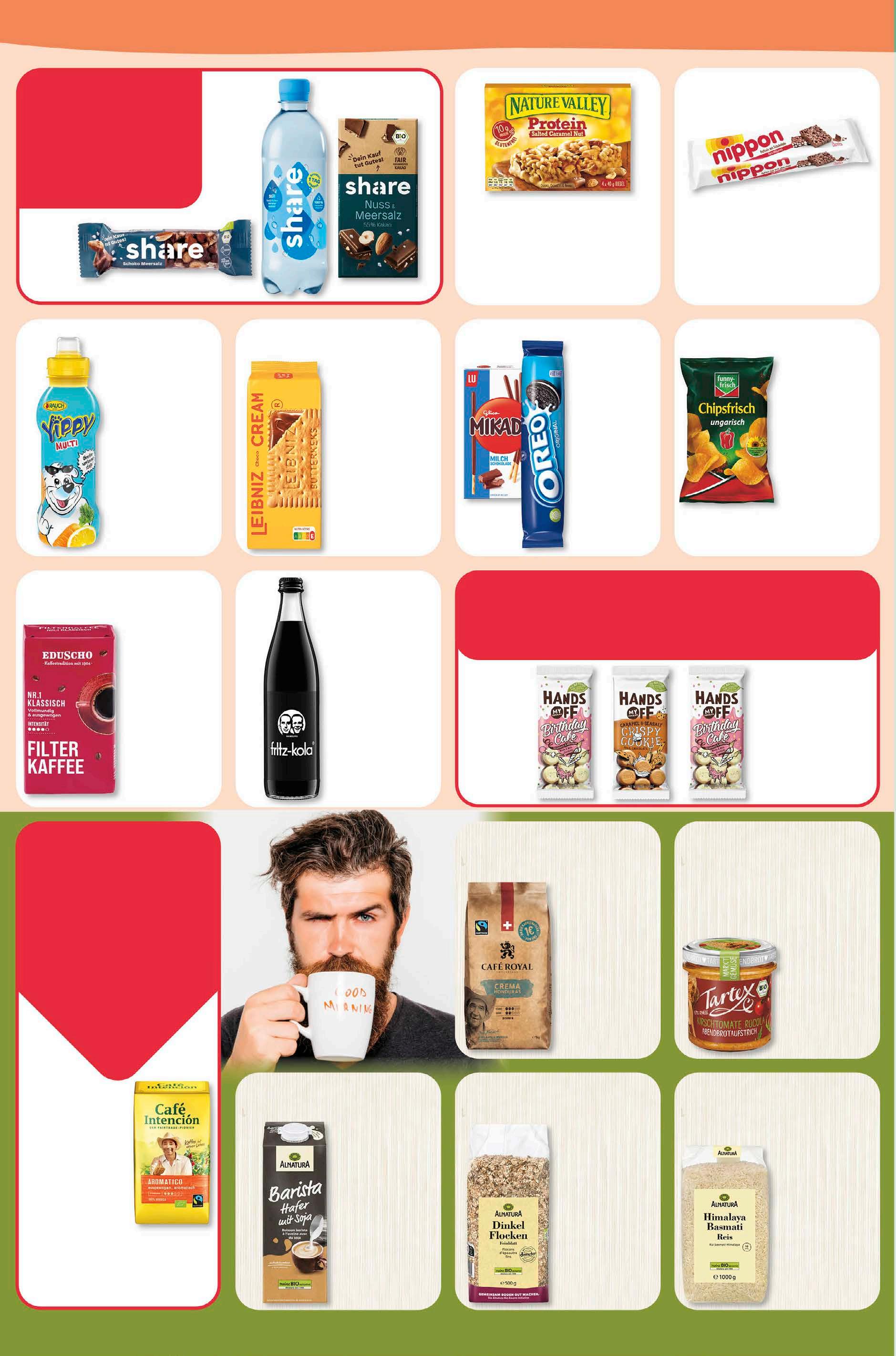 genuss Abgabe in haushaltsüblichen Mengen. Fritz-Kola versch. Sorten zzgl. 0,15 € Pfand Gesamtpr. 1,44 € 500 ml 1 l = 2,58 1,29 -22% UVP 1,65 Leibnitz Cream Schoko Keks 228 g 1 kg = 6,54 1,49 -35% UVP 2,29 Nature Valley Protein Riegel 4x 40 g 1 kg = 16,19 2,59 -26% UVP 3,49 Yippy Fruchtsaft versch. Sorten zzgl. 0,25 € Pfand Gesamtpr. 1,04 € 330 ml 1 l = 2,39 0,79 -20% UVP 0,99 Nippon Puffreiswaffeln 200 g 1 kg = 6,45 1,29 -26% UVP 1,75 Hands off my Chocolate versch. Sorten 100 g Einzelpreis 2,19 1 kg = 21,90 1,19 aktion Oreo Rolle oder Mikado Sticks 154/75 g 1 kg = 7,73/15,87 2,19 aktion Tartex Brotaufstrich versch. Sorten vegan 135/140 g 1 kg = 16,22/15,64 Eduscho Kaffee1 gemahlen versch. Sorten 500 g 1 kg = 7,98 aktion 3,99 1 Nur in ausgewählten Filialen erhältlich. 1 kg = 11,98 Café Intención gemahlen 500 g 1 kg = 13,98 6,99 -22% UVP 8,99 Alnatura Barista Pflanzendrink versch. Sorten 1 Liter 1,29 -13% UVP 1,49 Café Royal Honduras Crema ganze Bohne 1 kg 13,99 -26% UVP 18,99 Alnatura Dinkel Flocken versch. Sorten 500 g 1 kg = 2,78 1, 39 -22% UVP 1,79 Alnatura Himalaya Basmati Reis 1 kg 3,49 -13% UVP 3,99 20% rabatt auf alle artikel von share. 3 für 2 entspr./stück 1,46 1 kg = 14,60 dienstag happy deal am 5,99 UVP 8,99 -33% Funny-Frisch Chipsfrisch ungarisch 150 g 1 kg = 7,93 1,19 -40% UVP 1,99 max. 6 Packungen