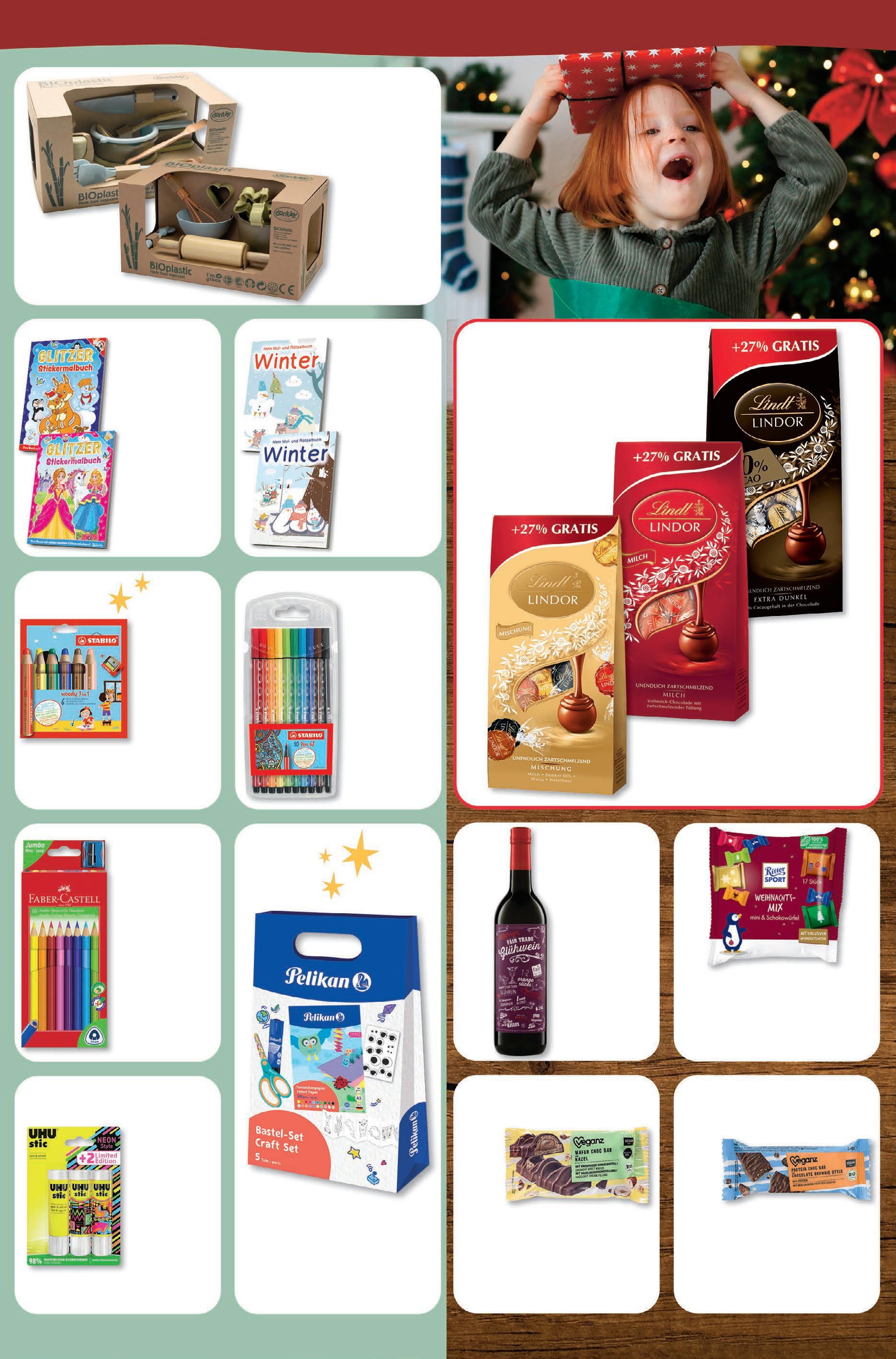 Stabilo Pen 68 10 Stück 6,99 -30% UVP# 9,99 Pelikan Bastelset 5-teilig 5,99 -40% UVP# 9,99 # Unverbindliche Preisempfehlung des Herstellers. geschenke für groß und klein Dantoy Back- oder Küchen-Set 11-teilig/ 12-teilig 12,99 -35% UVP# 19,99 WinterMalbuch versch. Motive Stück 1,99 -33% UVP# 2,99 Stabilo Woody Stifte Etui mit Anspitzer 6 Stück 8,99 -25% UVP# 11,99 Faber-Castell Jumbo Buntstifte 10 Stück 3,99 -33% UVP# 5,99 Uhu Neon Klebestift 3x 21 g 1 kg = 47,46 2,99 -25% UVP# 3,99 Veganz Wafer Choc Bar versch. Sorten vegan 30 g 1 kg = 33,00 0,99 -34% UVP# 1,49 Veganz Protein Choc Bar versch. Sorten vegan 50 g 1 kg = 29,80 1,49 -25% UVP# 1,99 Ritter Sport Bunter Weihnachtsmix 195 g 1 kg = 12,77 2,49 -17% UVP# 2,99 Marry‘s Fairtrade Glühwein 750 ml 1 l = 3,99 2,99 -25% UVP# 3,99 Glitzer Stickermalbuch XXL versch. Motive Stück 3,99 -20% UVP# 4,99 Lindt Lindor Kugeln versch. Sorten 175/174 g 1 kg = 22,80/22,93 aktion 3,99 3 für 9€ entspricht 3,00/stück.