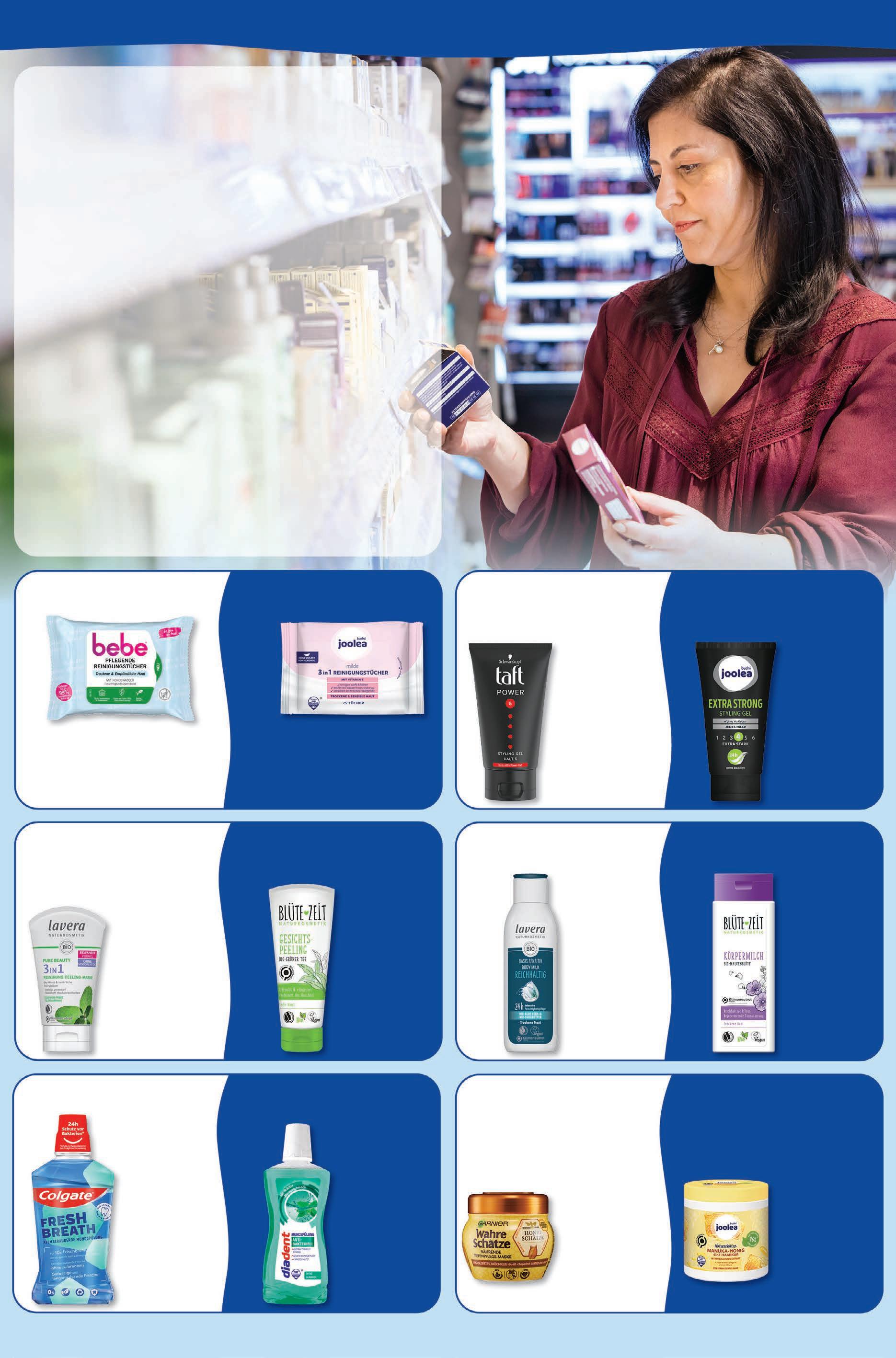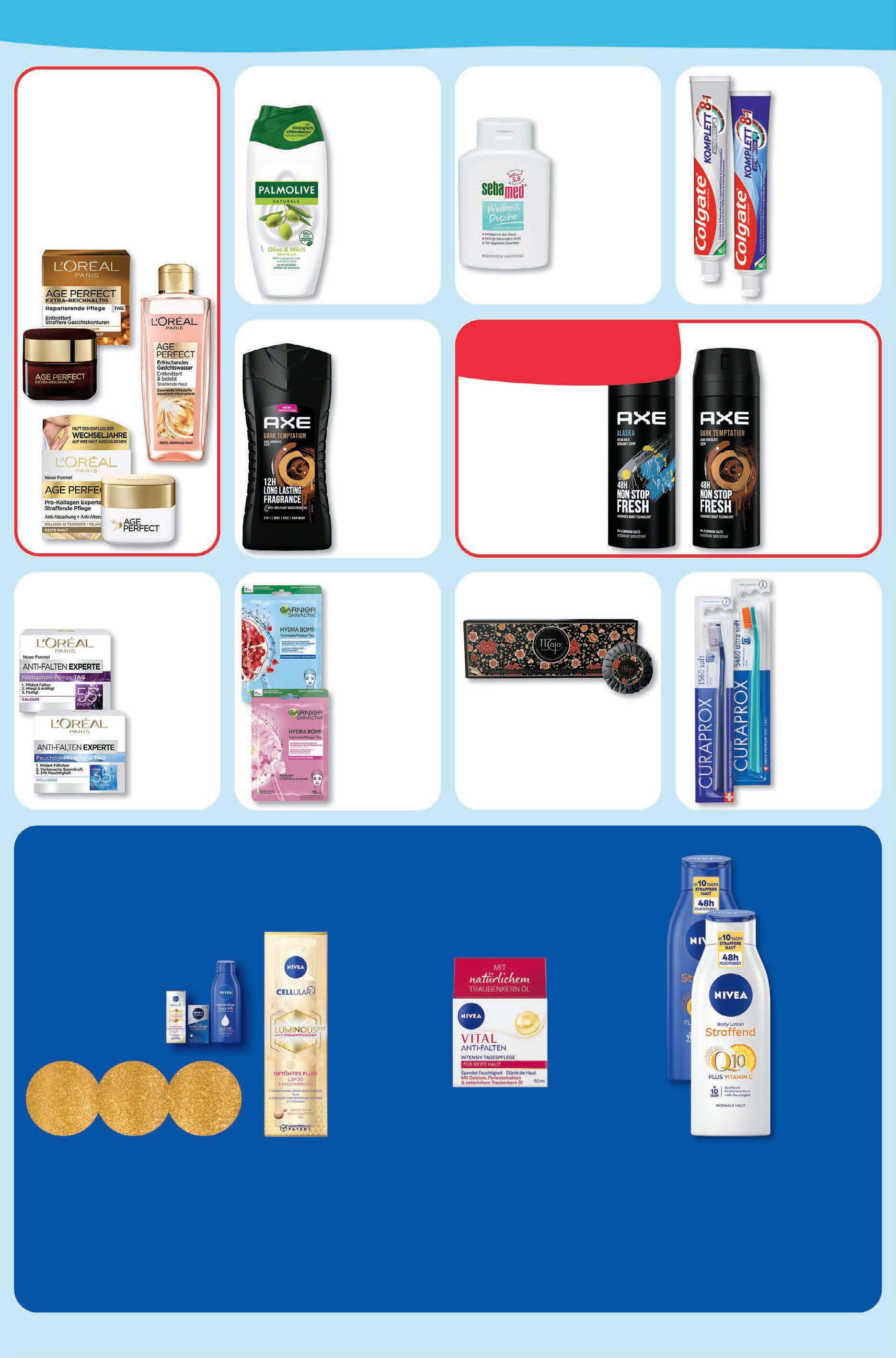 Günstigster Preis der letzten 30 Tage: Blüte-Zeit Baby Wundschutzcreme Calendula 2,19. ‡ Gleichzeitig günstigster Gesamtpreis der letzten 30 Tage. pflege & frische Nivea Cellular Luminous Anti Pigmentflecken Tagespflege 40 ml 1 l = 474,75 18,99 -17% UVP# 22,99 Nivea Q10 Body lotion oder Bodymilk versch. Sorten 400 ml 1 l = 16,23 6,49 -18% UVP# 7,89 L‘Oréal Anti-Falten Gesichtscreme versch. Sorten 50 ml 1 l = 75,80 3,79 -24% UVP# 4,99 Garnier Skin Active Hydra Bomb Tuchmaske versch. Sorten 28 g 1 kg = 63,93 1,79 -11% UVP# 1,99 Seba Med Duschgel versch. Sorten 200 ml 1 l = 9,95 1,99 -40% UVP# 3,29 Curaprox Zahnbürste versch. Sorten Stück 3,99 -19% UVP# 4,95 Colgate Komplett 8 Zahncreme versch. Sorten 75 ml 1 l = 10,53 0,79 -20% UVP# 0,99 Axe Duschgel versch. Sorten 250 ml 1 l = 7,96 1,99 -20% UVP# 2,49 Axe Deo Spray versch.Sorten 150 ml 1 l = 19,93 2,99 -21% UVP# 3,79 20% rabatt auf alle gesichtspflege artikel von l‘oréal age perfect . Maja Classic Seife 3x 100 g 1 kg = 16,63 4,99 -44% UVP# 8,99 1. NIVEA Produkte kaufen 2. Coupons an der Kasse abgeben und bis zu 10€ sparen1 Für 6€ kaufen 2€ RABATT Für 9€ kaufen 3€ RABATT Für 15€ kaufen 5€ RABATT + + JETZT SPAREN1 ¹NIVEA Produkte im Wert von mind. 6€ kaufen und bei Vorlage dieses Coupons 2€ Rabatt erhalten. Die verschiedenen Rabattcoupons der 10€ Weihnachts-Geld-Promo sind