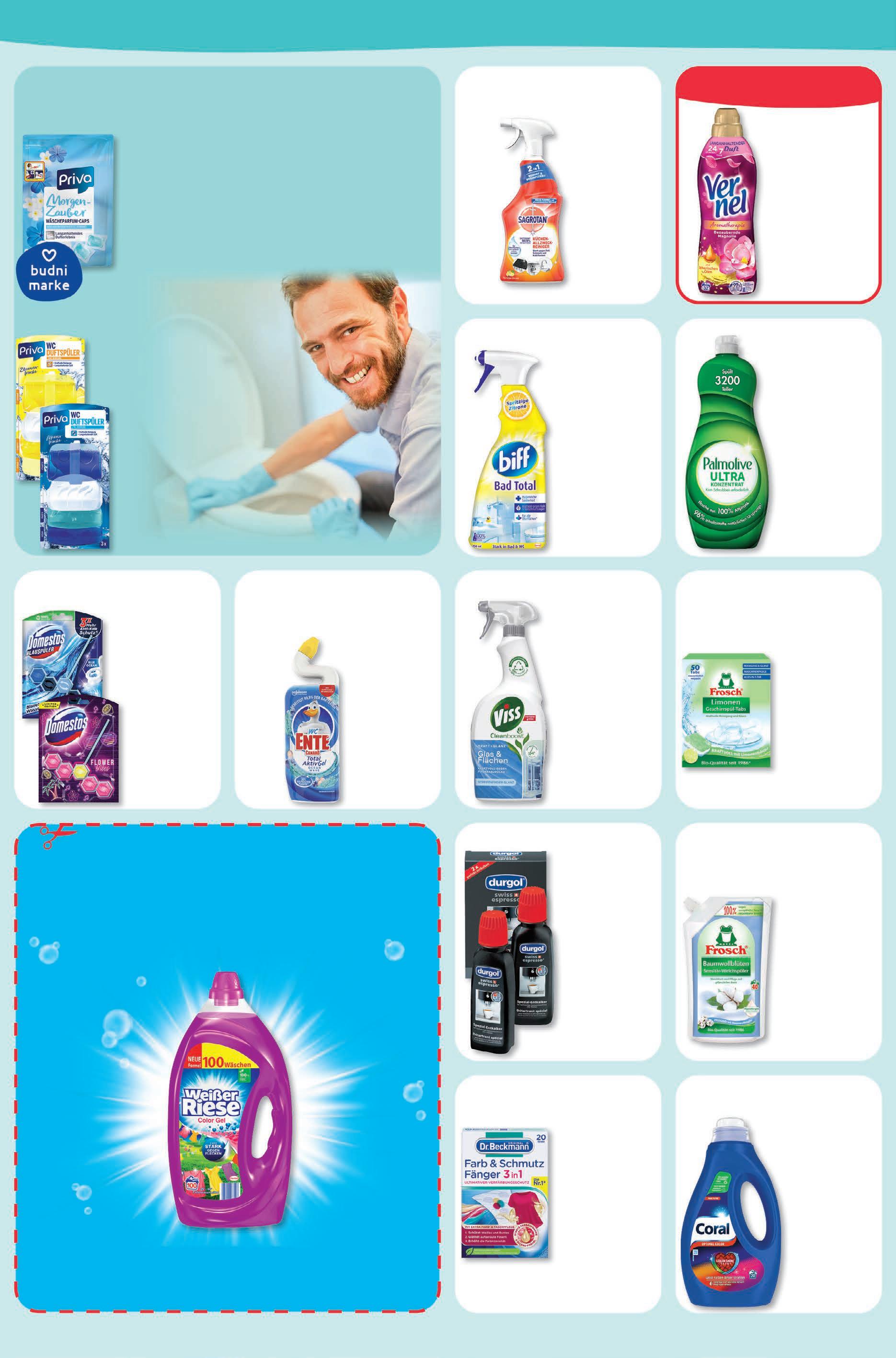 Biff Bad Total Reiniger 750 ml 1 l = 2,65 1,99 -33% UVP# 2,99 Sagrotan Küchen- oder Badreiniger1 750 ml 1 l = 3,72 2,79 -20% UVP# 3,49 1 Biozidprodukte vorsichtig verwenden. Vor Gebrauch stets Etikett und Produkt information lesen. Viss Bad- & Duschenoder Glas- & FlächenReiniger 750 ml 1 l = 2,12 1,59 -20% UVP# 1,99 Frosch Geschirrspül-Tabs vegan 50 WL 1 WL = 0,16 7,99 -27% UVP# 10,99 Domestos Power 5 WC Duftspüler versch. Sorten 53/55 g 1 kg = 24,34/23,45 1,29 -28% UVP# 1,79 1 Biozidprodukte vorsichtig verwenden. Vor Gebrauch stets Etikett und Produkt information lesen. Frosch Weichspüler versch. Sorten 1 Liter 1,79 -22% UVP# 2,29 Dr. Beckmann Farb- & SchmutzFänger 3in1 20 Stück 1,79 -18% UVP# 2,19 WC Ente Reiniger Gel1 versch. Sorten 750 ml 1 l = 1,93 1,45 -42% UVP# 2,49 Günstigster Preis der letzten 30 Tage: Favora Feuchtes Toilettenpapier 1,09. ‡ Gleichzeitig günstigster Gesamtpreis der letzten 30 Tage. 2 Keine Barauszahlung möglich. Nur ein Coupon pro Kaufakt einlösbar. Vervielfältigungen des Coupons werden nicht akzeptiert. Einlösbar bei budni. Aktionszeitraum vom 28.11. bis 03.12.2022. Weißer Riese Waschmittel Gel oder Pulver versch. Sorten 100 WL 1 WL = 0,10 9,99 -41% UVP# 16,99 3€ rabatt2 beim kauf von 2 weißer riese waschmitteln 100 wl. Coral Waschmittel Gel versch. Sorten 20 WL 1 WL = 0,15 2,99 -25% UVP# 3,99 Durgol SpezialEntkalker 250 ml 1 l = 19,96 4,99 -32% UVP# 7,29 Priva WC Duftspüler versch. Sorten 3x 55 ml 1 l = 6,73 1,11 -26% 1,49‡ budni marke saubere leistung! Priva Wäsche Parfum Caps 15x 5 ml 1 l = 33,20 2,49 -29% 3,49‡ waschen & haushalt knaller-preis Vernel Weichspüler versch. Sorten 32/34 WL 1 WL = 0,03 0,99 -50% UVP# 1,99 Palmolive Spülmittel versch. Sorten 750 ml 1 l = 1,45 1,09 -27% UVP# 1,49