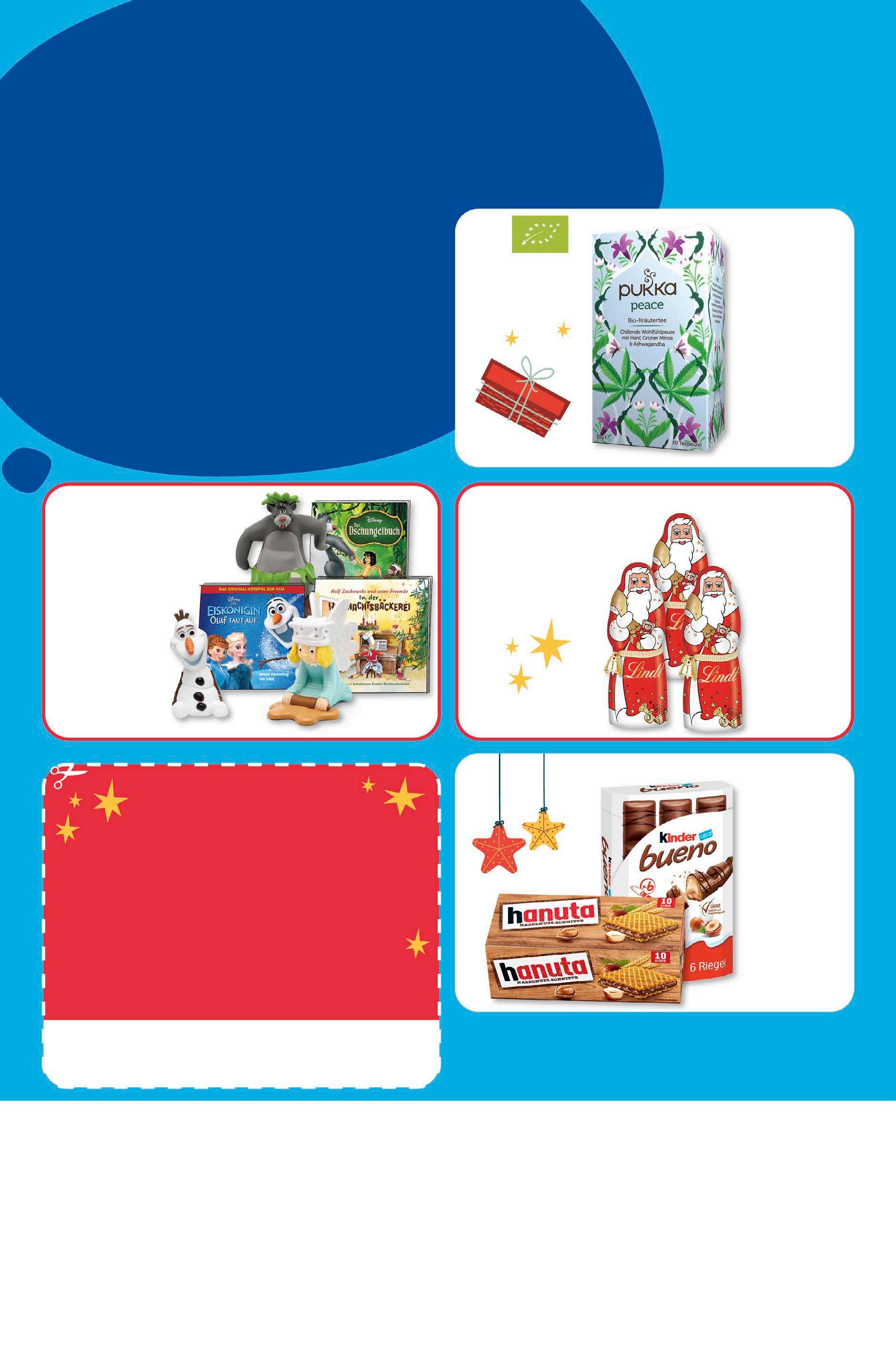 Alle Artikel mit dem FSC-Logo sind FSC zertifiziert NR8 www.blauer-engel.de /uz195 Dieses Druckerzeugnis wurde mit dem Blauen Engel ausgezeichnet. # Unverbindliche Preisempfehlung des Herstellers. super deals nur gültig von donnerstag bis samstag. do fr sa 10% advents-rabatt auf deinen einkauf ab 20 €. Gültig vom 28.11. bis 03.12.2022 in Deinem budni. Nicht mit anderen Coupons und Aktionen kombinierbar. Gilt nicht für Sapur Reinigungsgerät, Blumen und Saaten, Tchibo, Sofortprint, Foto-Laborarbeiten, Bijou Brigitte, preisgebundene Artikel, Treuepunktaktionen, Bücher und Zeitschriften, Pfand und Zylinder (Soda Club etc.), Gutschein- und Telefonkarten sowie Pre- und Anfangsmilchnahrung. 3 für 2 entspricht 1,79/stück. Pukka Tee versch. Sorten vegan 20x 1 g 1 kg = 149,50 2,99 -25% UVP# 3,99 Hanuta oder Kinder Bueno 10/6 Waffeln/ Riegel 220/129 g 1 kg = 6,77/11,55 1,49 -38% UVP# 2,39 Lindt Weihnachts mann 70 g 1 kg = 38,43 aktion 2,69 20% rabatt auf alle tonies2 . 2 nur in ausgewählten filialen erhältlich. Kundenservice 040 80 60 30 30 info@budni.de Filialübersicht budni.de/filialen Newsletter budni.de/newsletter @ App budni.de/app Social Media facebook.com/budni instagram.com/budni über 190x für dich da. Unsere Teams freuen sich auf Deinen Einkauf. Die Öffnungszeiten Deiner Filiale findest Du auf unserer Homepage und in der App.