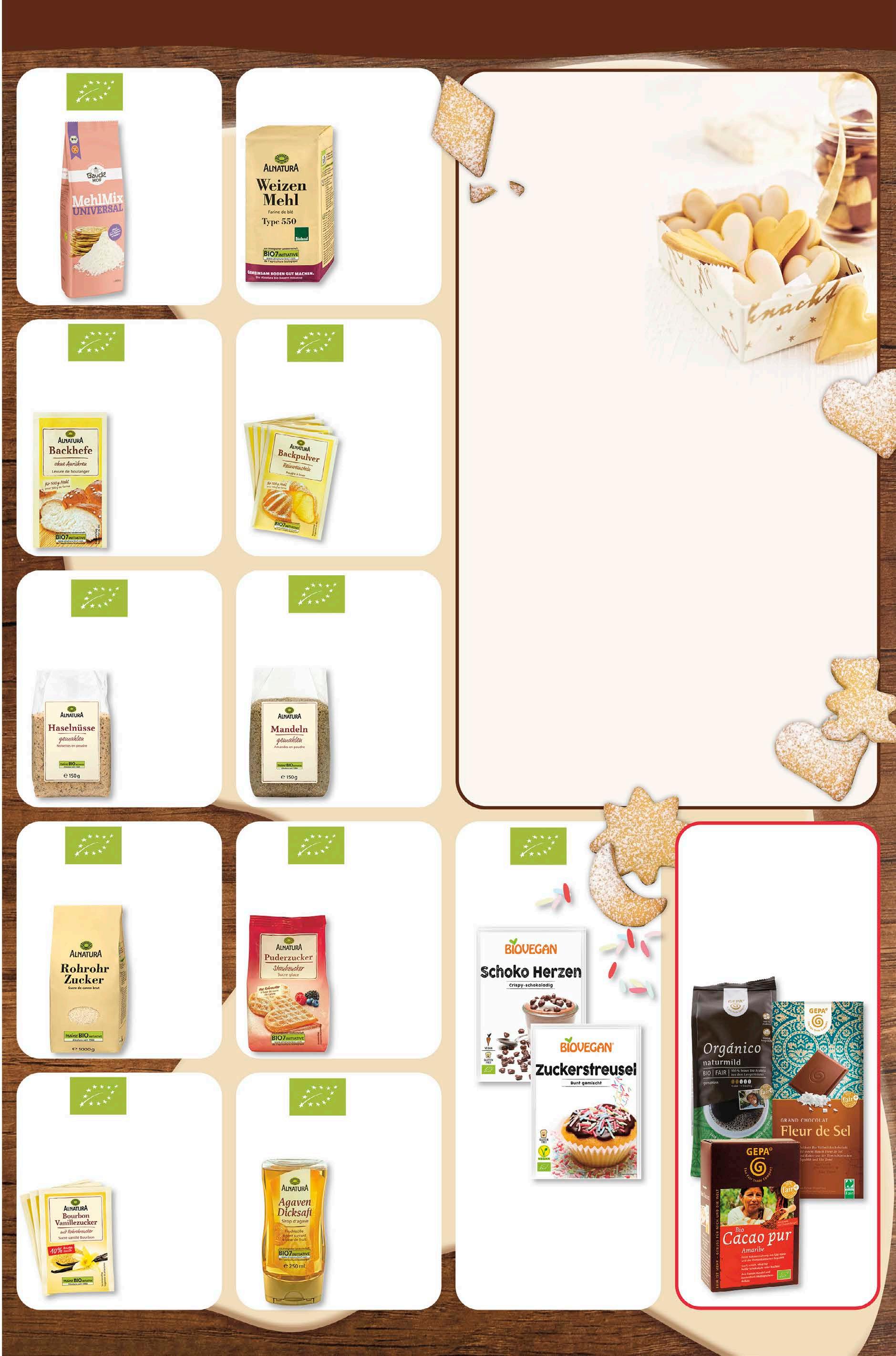in der weihnachtsbäckerei... Alnatura Rohrzucker 1 kg 2,19 -12% UVP# 2,49 20% rabatt auf alle artikel von gepa. Biovegan Schoko Herzen oder Zuckerstreusel vegan 35/70 g 1 kg = 48,29/24,14 1,69 -29% UVP# 2,39 Alnatura Weizenmehl 1 kg 1,19 -14% UVP# 1,39 Alnatura Haselnüsse gemahlen 150 g 1 kg = 16,60 2,49 -17% UVP# 2,99 Alnatura Mandeln gemahlen 150 g 1 kg = 19,93 2,99 -14% UVP# 3,49 Alnatura Puderzucker 200 g 1 kg = 6,45 1,29 -24% UVP# 1,69 Alnatura Backpulver 4x 18 g 1 kg = 10,97 0,79 -20% UVP# 0,99 Alnatura Backhefe 9 g 1 kg = 54,44 0,49 -29% UVP# 0,69