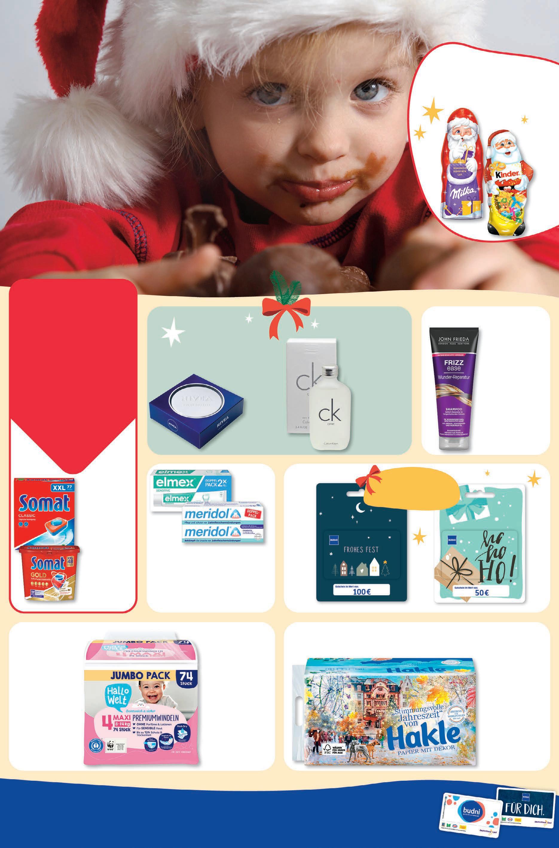 KW 48 Gültig vom 28.11. bis 03.12.2022 20% rabatt auf alle schokoladenhohlfiguren.1 1 ausgenommen Lindt Weihnachtsmann 70 g und Kinder Ü-Ei. Somat Geschirrspül Tabs versch. Sorten 48/77 WL 1 WL = 0,16/0,10 7,49 -25% UVP# 9,99 Meridol oder Elmex Sensitive Zahncreme Doppelpack 2x 75 ml 1 l = 33,27 4,99 -17% UVP# 5,99 Solange der Vorrat reicht Irrtümer vorbehalten # Unverbindliche Preisempfehlung des Herstellers Günstigster Preis der letzten 30 Tage: Hallo Welt Premium Windeln 7,34. geschenke für dich Toller Advents-Rabatt auf der Rückseite Calvin Klein One Eau de Toilette 100 ml 19,99 -60% UVP# 50,00 Noch keine DeutschlandCard? Dann schnell in der App, auf budni.de oder in Deinem budni registrieren. punkten und sparen Hallo Welt Premium Windeln versch. Größen Jumbopack 74 Stück 8,79 -16% 10,49 budni marke John Frieda Shampoo oder Spülung versch. Sorten 250 ml 1 l = 23,96 5,99 -14% UVP# 6,99 Nivea Creme Eau de Toilette 30 ml 16,99 -29% UVP# 24,00 sichere dir deine gratisgutscheinkarte2 +10 € 2 +5 € 2 2 max. 5 Karten pro Kunde.Kaufe eine 100 € oder 50 € budni -Geschenkkarte und erhalte eine 10 € oder 5 € budni -Geschenkkarte dazu. 1 WL = 0,14/0,09 happy deal am 6,66 -33% dienstag UVP# 9,99 Hakle Toiletten papier 3-lagig 16x 150 Blatt 5,44 -21% UVP# 6,89 dein drogeriemarkt