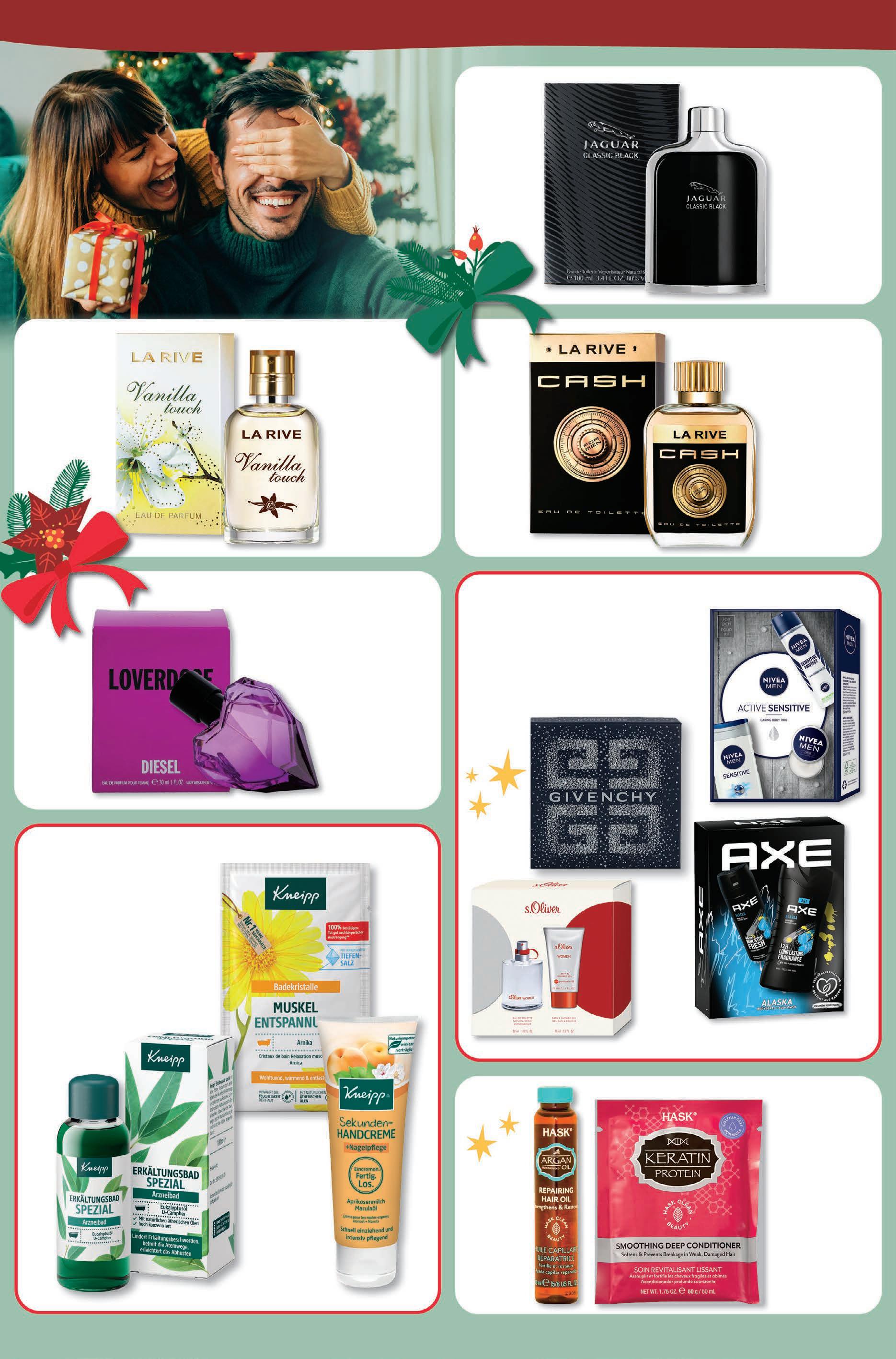vom nikolaus empfohlen 20% rabatt auf alle pflegeartikel von kneipp. Jaguar Classic Black Eau de Toilette 100 ml 14,99 -46% UVP# 27,80 La Rive Cash Men Eau de Toilette vegan 100 ml 4,99 -29% UVP# 6,99 La Rive Vanilla Touch Eau de Parfum vegan 30 ml 2,99 -40% UVP# 4,99 Hask Argan Oil Haaröl oder Haarkur versch. Sorten 18 ml/50 g 1 l/kg = 110,56/39,80 1,99 -33% UVP# 2,99 Diesel Loverdose Women Eau de Parfum 30 ml 23,99 -11% UVP# 26,99 10% rabatt auf alle geschenk-sets. # Unverbindliche Preisempfehlung des Herstellers.