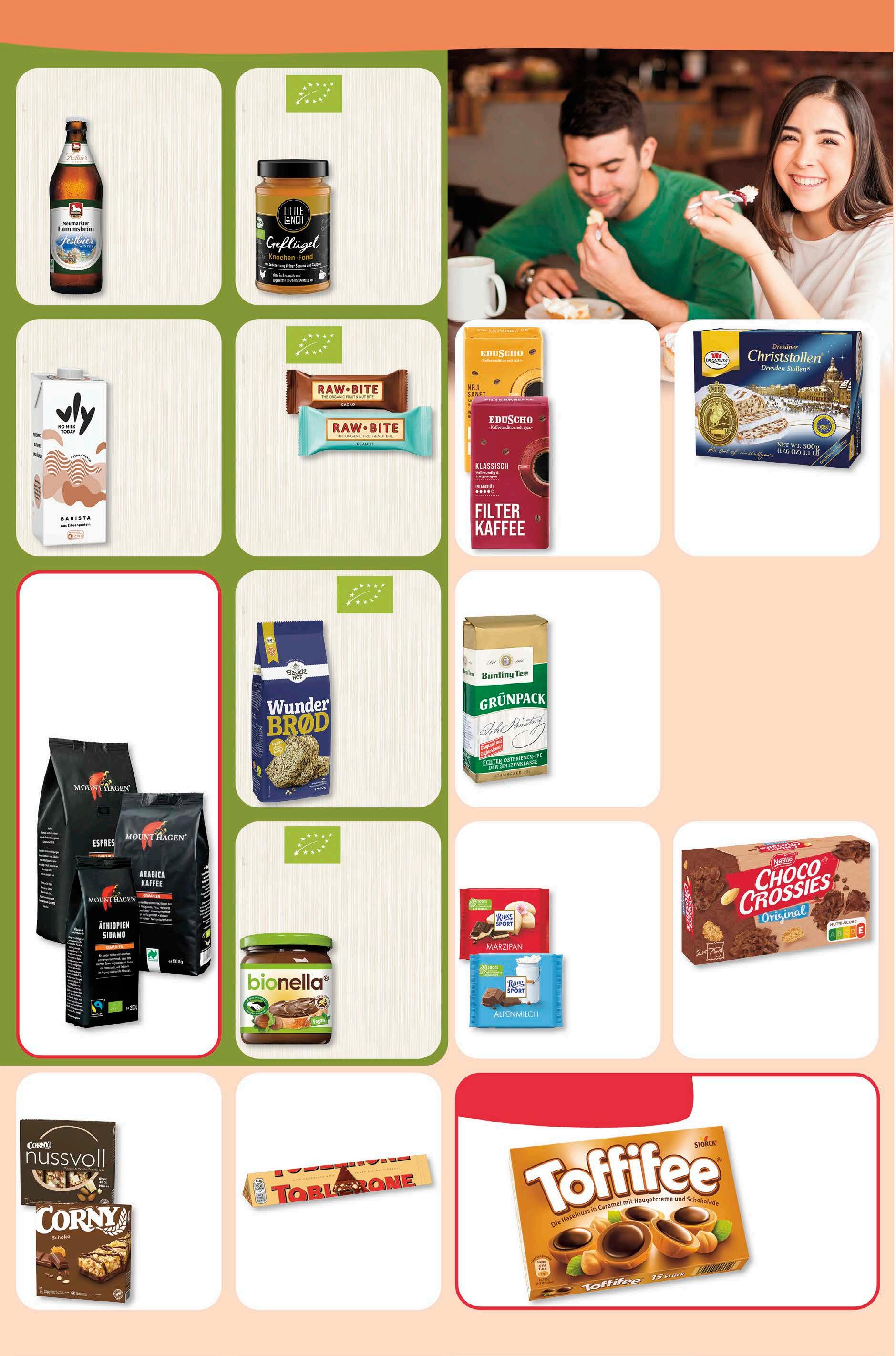 Baukhof Wunderbröd glutenfrei 600 g 1 kg = 5,48 3,29 -18% UVP# 3,99 Lammsbräu Bier versch. Sorten zzgl. 0,08 € Pfand Gesamtpr. 1,07 € 500 ml 1 l = 1,98 0,99 -17% UVP# 1,19 genuss Little Lunch Fond versch. Sorten 400 ml 1 l = 6,73 2,69 -33% UVP# 3,99 Raw Bite Riegel versch. Sorten vegan 50 g 1 kg = 35,80 1,79 -10% UVP# 1,99 Ritter Sport Schokolade versch. Sorten 100 g 1 kg = 7,90 0,79 -39% UVP# 1,29 Dr. Quendt Dresdner Christstollen 500 g 1 kg = 11,10 5,55 -21% UVP# 6,99 20% rabatt auf alle artikel von mount hagen. Vly Barista Milchalternative versch. Sorten vegan 1 Liter 1,99 -20% UVP# 2,49 Eduscho Filterkaffee versch. Sorten 500 g 1 kg = 8,98 4,49 -36% UVP# 6,99 Corny Riegel versch.Sorten 150 g 1 kg = 7,40 1,11 -38% UVP# 1,79 Toblerone 100 g 1 kg = 12,90 1,29 -13% UVP# 1,49 Choco Crossies Classic 2x 75 g 1 kg = 9,27 1, 39 -39% UVP# 2,29 über 1.100 produkte zu discountpreisen! Bünting Grünpack Tee 500 g 1 kg = 11,98 5,99 -29% UVP# 8,49 Bionella Nuss-NougatCreme 400 g 1 kg = 8,73 3,49 -21% UVP# 4,39 # Unverbindliche Preisempfehlung des Herstellers. Toffifee 125 g 1 kg = 8,00 1,00 -41% UVP# 1,69 knaller-preis