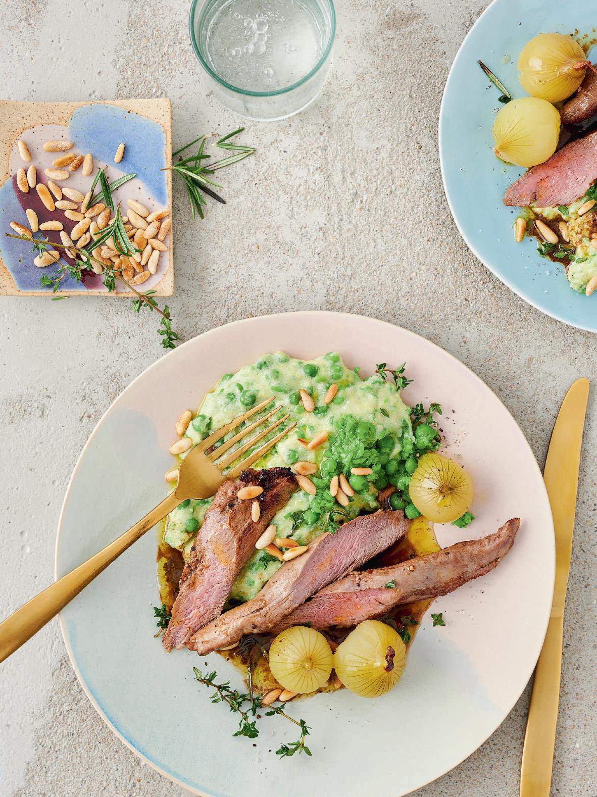 4 Zwiebeln noch einmal aufkochen und mit der Polenta auf Tellern anrichten. Die Lammfilets halbieren und mit dem Bratensaft neben der Polenta anrichten. Mit den Pinienkernen und frischem Thymian bestreuen.