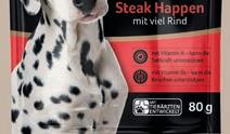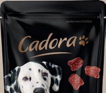 Die „Steak Happen“ von Cadora sind ideal als Ergänzungsfutter für ause a sene unde mit einem hohen Anteil an Fleischrohstoffen (95 %).