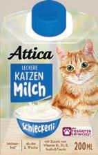 Ab der 6. Woche freuen sich Katzen über die „Leckere Katzenmilch“ von Attica – mit Vitamin B1, D3, E, Inulin und Taurin.