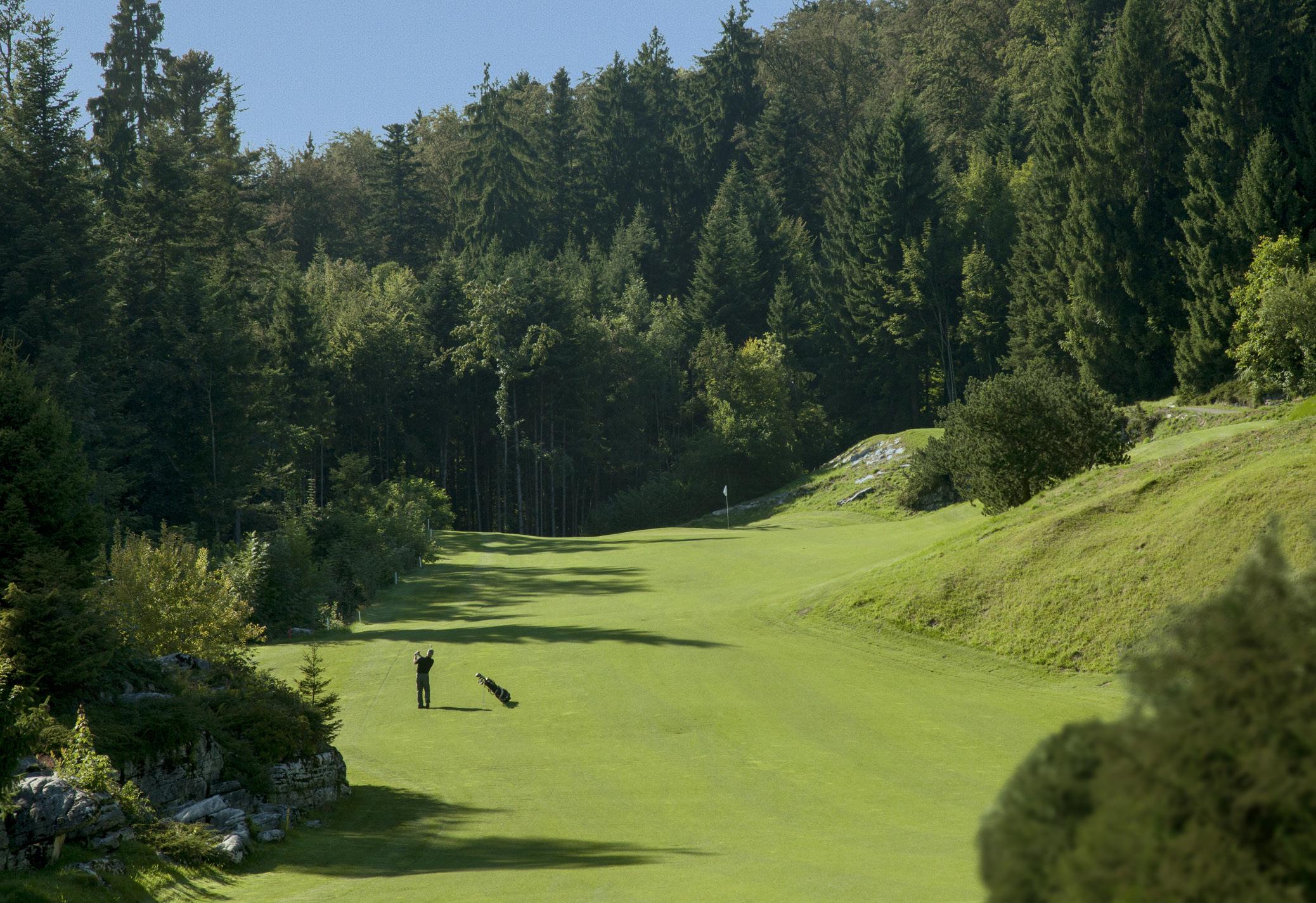Friedrich Frey-Fürst had an innovative plan for turning the marshy ground into a picture-perfect golf course. First, the workers uncovered a number of glacial crevices and mills and removed valuable topsoil from within them. Later, they refilled these cavities with the blasted rock from the site. On top of the rock, they then laid the soil that had been collected from the crevices and mills, or brought up with trucks from the valley. This provided the foundation for an attractive golf course and supported a cover of grass suited to the sport. The new golf course covered an expance of six hectares, with all nine holes surrounded by stands of beech and spruce.