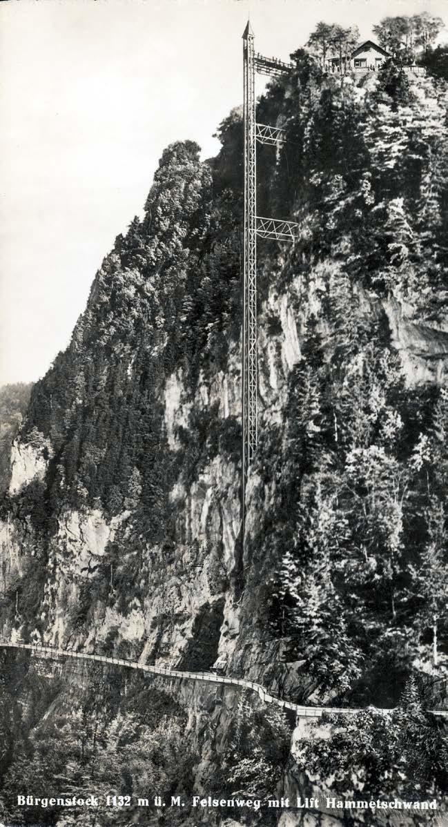 Gewagte Leistungen. Im Jahr 1900 begann Bucher mit dem Bau eines schattigen Spazierwegs, damit die Gäste die fantastische Landschaft wirklich geniessen konnten. Der Bau des Felsenwegs war mit den damaligen technischen Möglichkeiten ein gefährliches Unterfangen. Mutige Bergleute aus Österreich und Italien setzten Sprengstoff ein, um ihn auszuheben, und vollführten waghalsige akrobatische Kunststücke, als sie 600 Meter über dem See hingen, um an der Felswand zu arbeiten. Zwischen dem Felsenweg und dem Berggipfel lagen noch 152 Meter — zu verlockend für Bucher — hier war der Moment für seinen Schweizer Eiffelturm gekommen.